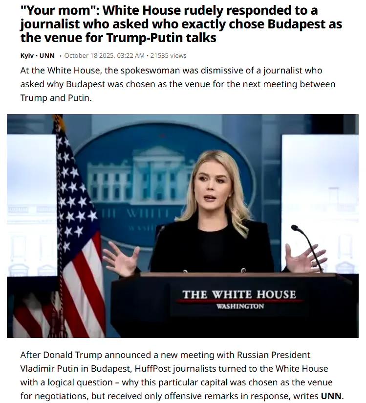 《赫芬顿邮报》在白宫记者会上向白宫新闻秘书莱维特提出了一个问题:“谁选择布达佩斯作为会晤地点?” 没想到莱维特发飙了,回答说:“你妈选的!” 紧跟着,白宫通讯联络办公室主任史蒂文·张又补充了一句更简洁的回应,“你妈。”(Your mom.) 英国《独立报》报道称,在这之后又有记者向白宫发言人泰勒·罗杰斯提问,“你妈”这样的话作为官方回答是否合适?泰勒·罗杰斯称,这样的回应 “非常恰当”。 实际上,莱维特还对《赫芬顿邮报》 进行了更大的发飙。因为《赫芬顿邮报》也是犯贱,在莱维特“你妈选的!”回答之后,又去询问莱维特:“你是否认为自己的回答非常有趣?”很快,《赫芬顿邮报》就收到了莱维特满是火药味的回复:“你居然真把自己当个记者了,真有意思。你就是个极左翼的马屁精,没人把你当回事。包括你媒体圈的同事,他们只是没当面告诉你而已。别再给我发你那些虚伪、带有偏见的狗屁问题了。” 我们有句俗话“什么人玩什么鸟”,放到今天的美国身上也完全适用。可不就是老特啥样,手下人也是啥样嘛。莱维特虽然年纪不大,但是很彪悍,出口成脏。