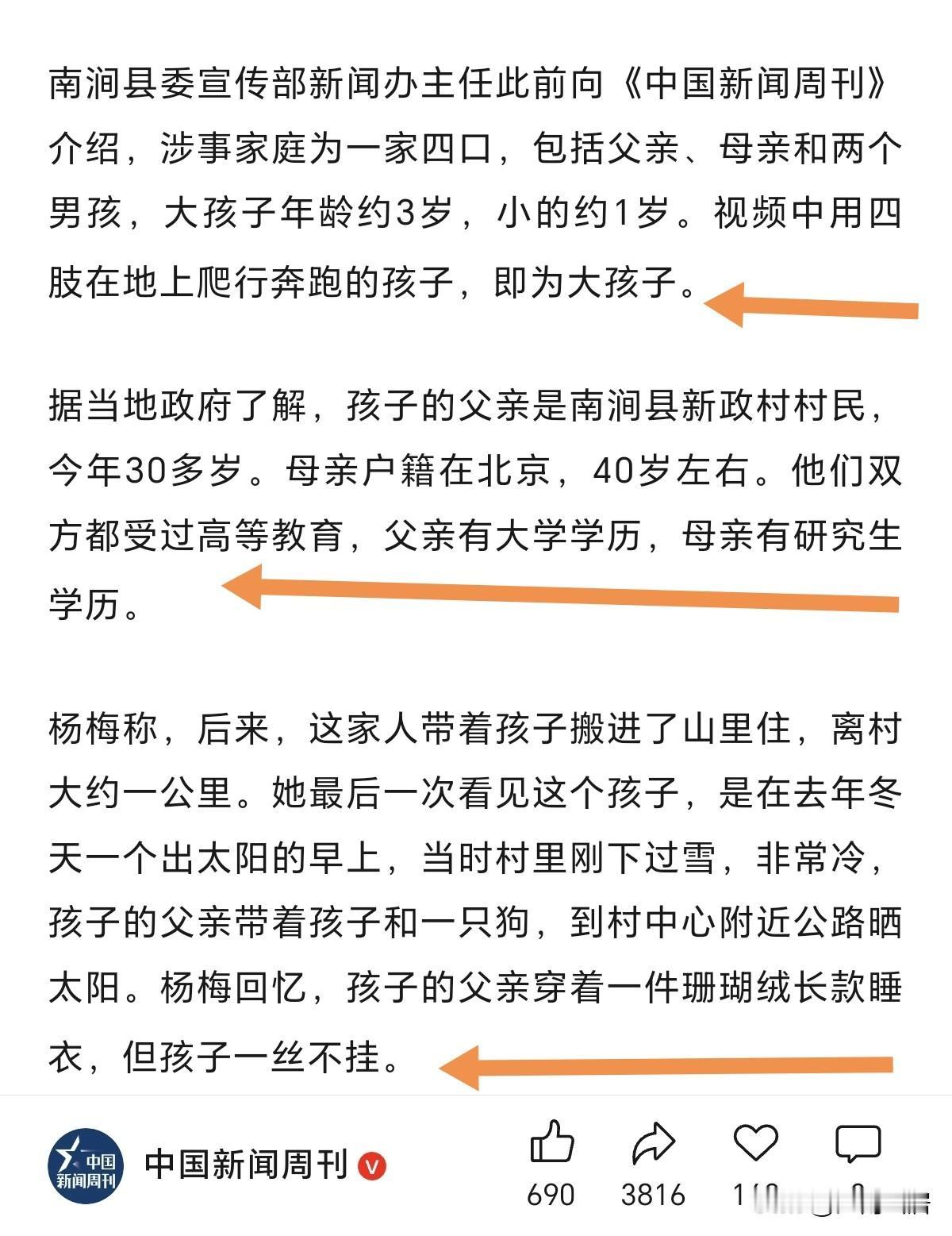父母双方都是受过高等教育的,父亲大学学历,母亲研究生学历。为何要把孩子养成“野人”呢?把小孩子散养,让孩子不穿衣服,用四肢奔跑,真的很怪异。不管这段父母经历了什么,以这样的方式教育小孩,把孩子养成“野人”,终究是缺乏合理性的。就算给不了孩子优越的生活,至少也要给予温饱,给予最大的耐心去教导。 来源:中国新闻周刊