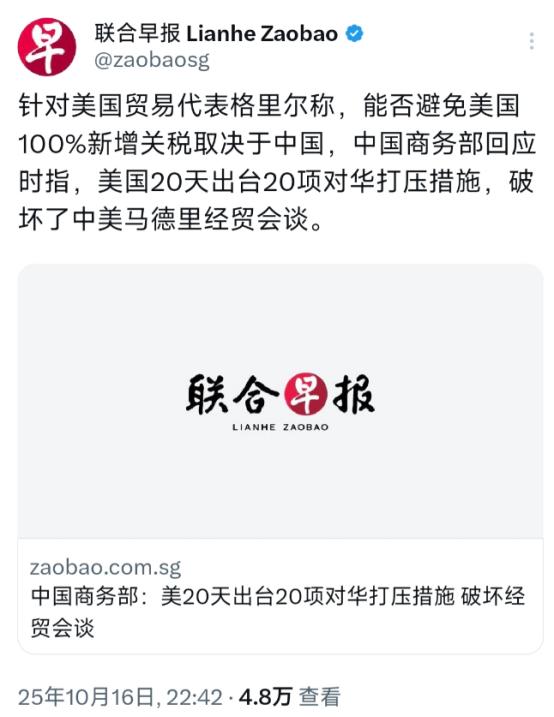 外媒10月16日晚报道:“针对美国贸易代表格里尔称,能否避免美国100%新增关税取决于中国,中国商务部回应时指,美国20天出台20项对华打压措施,破坏了中美马德里经贸会谈。” 没等多久,中国商务部就直接亮明了立场。商务部发言人明确指出,最近这20天里,美国这边一口气出台了20项对华打压措施,正是这些举动,把之前中美在马德里刚谈好的经贸会谈氛围全给破坏了。 这话可不是空口说白话,每一项打压措施都有实实在在的内容,从限制技术出口到加严投资审查,几乎把中美经贸合作的几个关键领域都裹了进去。 要知道,之前中美在马德里的经贸会谈,本来是双方都带着诚意去的。 当时两边的谈判团队坐下来,针对农产品贸易、知识产权保护这些老问题聊了不少,甚至在部分领域还初步达成了一些共识。 不少行业内的人都觉得,这可能是中美经贸关系缓和的一个信号,毕竟两边的企业都盼着稳定的合作环境,别总被关税和限制政策牵着走。 可谁能想到,会谈结束还没满月,美国这边就开始密集出台打压政策。先是针对中国的新能源企业,加严了进口审查,说要防范所谓的“技术转移风险”,这直接影响了中国光伏组件和电动汽车的对美出口。 紧接着,又把十几家中国科技公司列入了所谓的“实体清单”,限制它们购买美国的芯片和软件,理由还是那套老掉牙的“国家安全”。 这还不算完,美国在农产品领域也没闲着。之前中国好不容易恢复了部分美国农产品的采购,结果美国这边突然宣布,要对中国输美的部分农产品重新加征检验检疫费用,说是为了“保障美国消费者安全”。可明眼人都看得出来,这就是变相增加中国农产品的出口成本,跟加关税没什么两样。 这些打压措施一出来,中国企业最先感受到压力。有家做光伏的企业负责人就说,本来他们已经跟美国的经销商谈好了年底的供货合同,结果美国的新审查政策一落地,合同直接被搁置了,经销商怕担风险,宁愿违约也不敢继续合作。 还有做芯片设计的公司,因为被列入“实体清单”,之前订购的美国芯片直接被断供,生产线都快停了,只能紧急找其他国家的替代产品,可短期内哪那么容易找到合适的。 中国商务部之所以在回应里强调这些打压措施破坏了马德里会谈,就是因为美国的做法完全违背了会谈时的承诺。 当时在马德里,美国代表还亲口说会“谨慎使用贸易限制措施”,会考虑中国企业的合理诉求,结果转头就把这些话抛到了脑后。这种出尔反尔的行为,不仅让之前的会谈成果打了水漂,更让中国对美国的合作诚意产生了怀疑。 格里尔说“能否避免新增关税取决于中国”,这话听着就没道理。明明是美国先不断出台打压政策,破坏了双方的合作基础,现在反而把责任推给中国,这根本就是颠倒黑白。 中国一直都主张通过对话协商解决经贸分歧,也愿意在平等互利的基础上跟美国合作,但前提是美国得拿出诚意,别一边谈合作一边搞打压,这种两面派的做法谁也受不了。 而且从实际情况来看,美国的这些打压政策,最后伤害的其实也是美国自己。 就拿芯片行业来说,中国是美国芯片最大的消费市场之一,美国限制中国企业购买美国芯片,直接导致美国的芯片厂商销量下滑。 有家美国芯片公司最近公布的财报显示,因为对中国的出口受限,他们三季度的营收同比下降了23%,还不得不裁员来缩减成本。 在农产品领域也是一样,美国农民本来盼着通过马德里会谈,中国能多买些美国的大豆和玉米,结果美国这边又搞出检验检疫加费的政策,中国买家只能暂时搁置采购计划,转而去巴西和阿根廷进货。 美国伊利诺伊州的一位大豆农场主就抱怨说,去年他还能卖给中国不少大豆,今年因为政策变动,仓库里的大豆都堆满了,价格还一天比一天低,再这么下去,明年可能都没钱买种子了。 中国商务部的回应,其实也是在提醒美国,经贸合作不是单方面的,得讲究相互尊重、平等互利。如果美国继续这么一边放狠话要加关税,一边密集出台打压措施,那中美经贸关系只会越来越糟,最后两边都得吃亏。 现在关键不是看中国怎么做,而是美国得先停下那些破坏合作的行为,拿出真正的合作诚意,这样才能让中美经贸会谈回到正轨,也才能避免新增关税给两国带来更大的损失。 毕竟不管是中国企业还是美国企业,不管是中国消费者还是美国农民,大家都不想被关税和限制政策折腾。 只有双方都坐下来,好好谈,少搞点小动作,多为对方考虑考虑,中美经贸关系才能稳定发展,这对谁来说都是好事。 可要是美国还抱着那种“我想怎么样就怎么样”的态度,继续出尔反尔,那别说避免新增关税了,之前好不容易建立起来的合作信任,恐怕也会彻底没了。