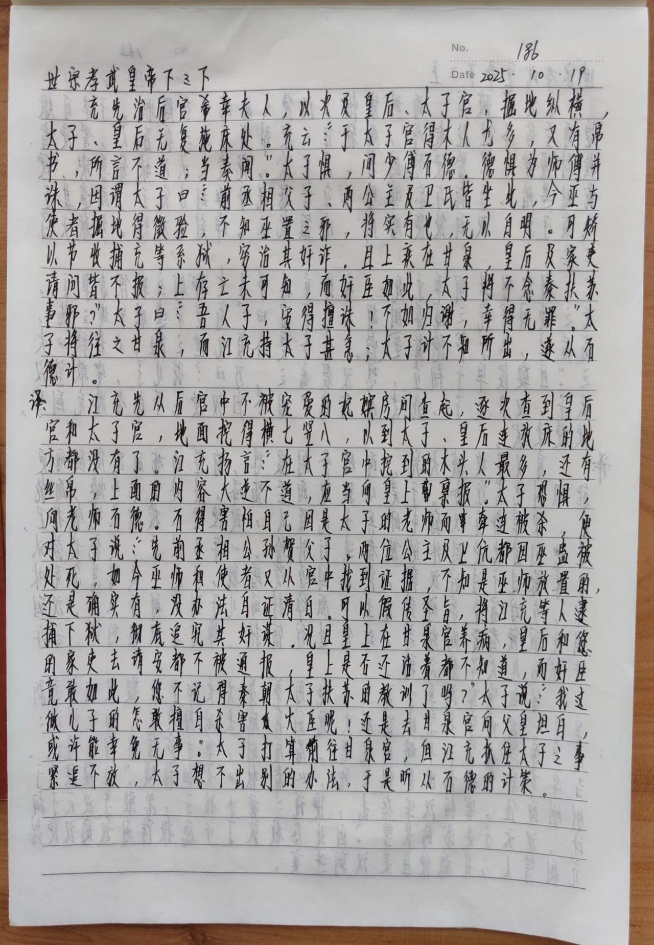看帝王权谋,抄《资治通鉴》第186天。 江充到宫中查巫蛊,查到说太子宫中的木头人最多,要上报皇上。太子害怕,他的师傅石德建议假传圣旨,逮捕江充等人。 太子不敢,打算亲自去甘泉宫向汉武帝说明情况,但江充逼得很紧,太子无计可施,只好听从石德的计策。