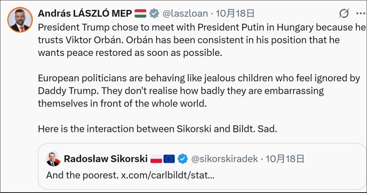 【#匈议员嘲讽欧洲政客被特朗普爸爸忽视了# 】新一轮俄美领导人会晤有望在匈牙利举行,这让欧盟在意外之余心里很不是滋味。