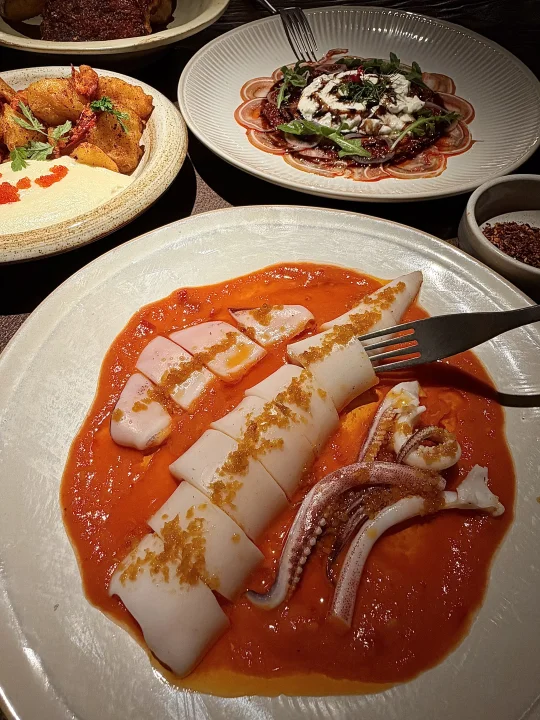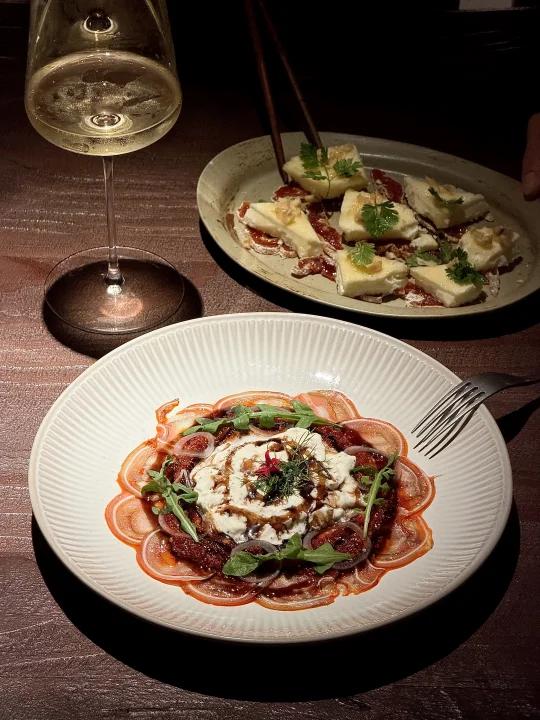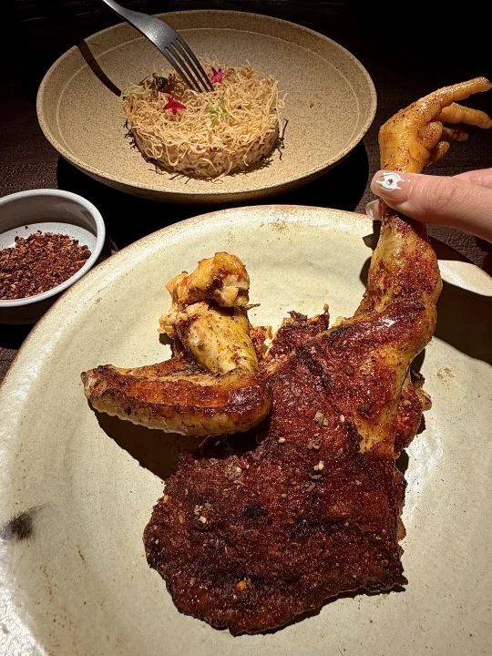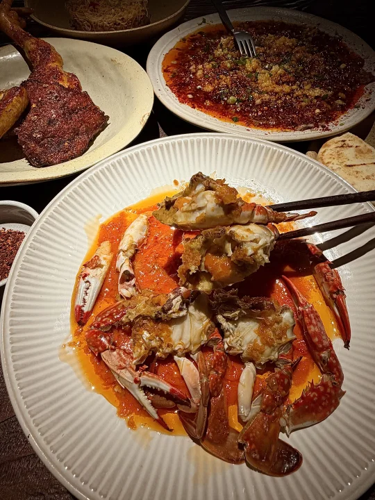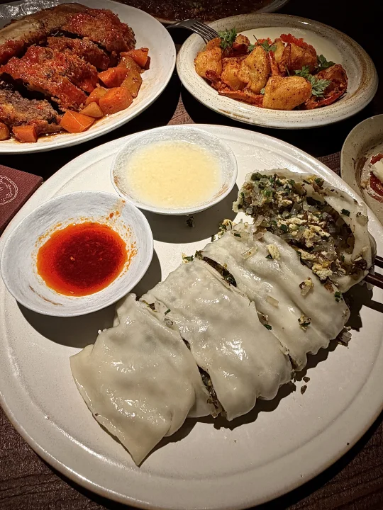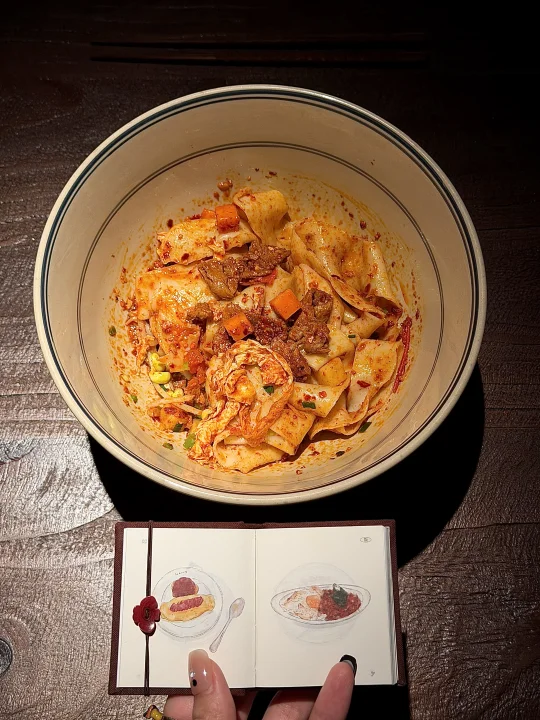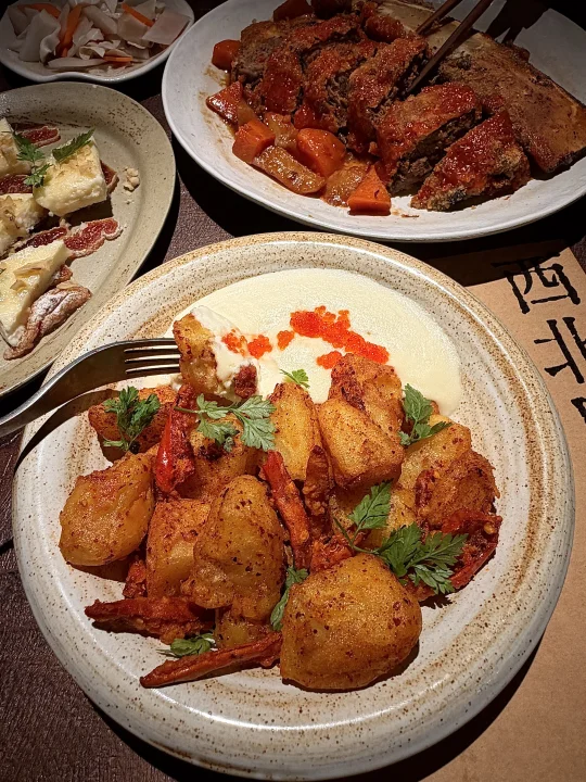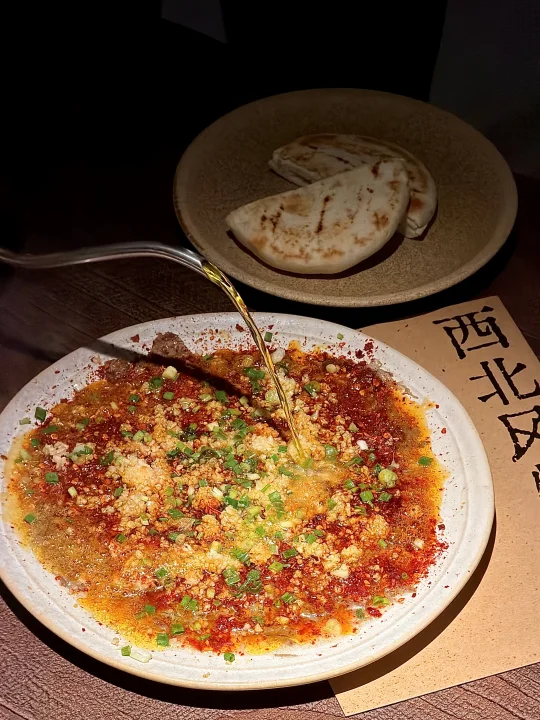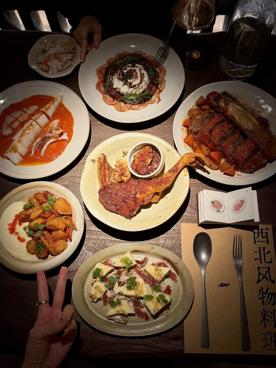 西北Bistro吼吼吃😭…… - 店里都是明火现炒🔥主厨还是上海 「泰安门」行政总厨的嫡传弟子!! ✔️蒜泼羊肉 羊腿肉jujuju嫩🐑现场泼热油喷醋后一整个香晕了!! ✔️带骨牛肋排 一整根带骨牛肋排搭配西北酸辣酱和土豆烩菜🥔口感层次嘎嘎丰富!肉食者狂喜!! ✔️土豆沾土豆 酥脆炸土豆蘸上黏黏糯糯土豆泥~双重碳水的快乐谁懂🥹 ✔️奶皮子配柿饼 奶呼呼奶皮子配上香甜软糯的柿饼~一口就是秋天的味道🍂 ✔️一根员工餐 超长手工扯面裹满热油和臊子~嗦得停不下来🤤!!