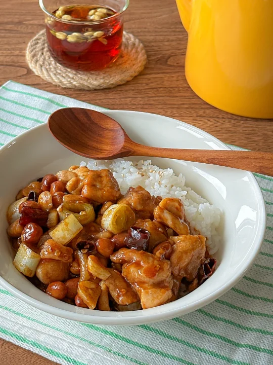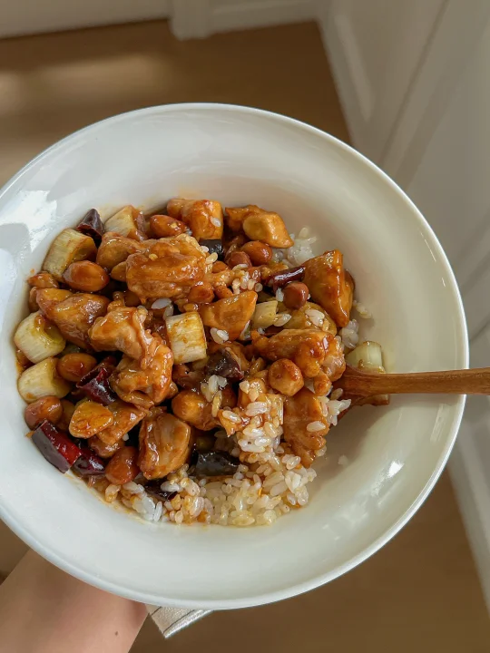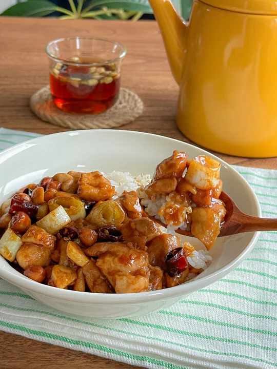 琥珀色的酱汁裹着嫩鸡丁;隔着屏幕我都想尝一口