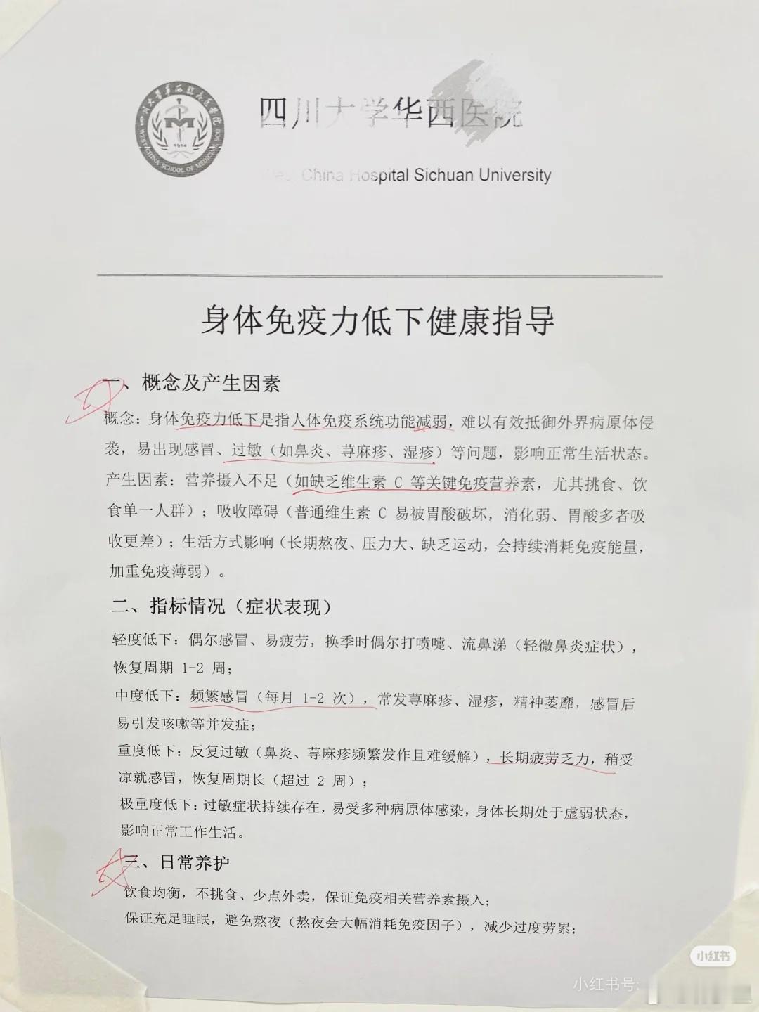 华西医院对免疫力低下的指导。