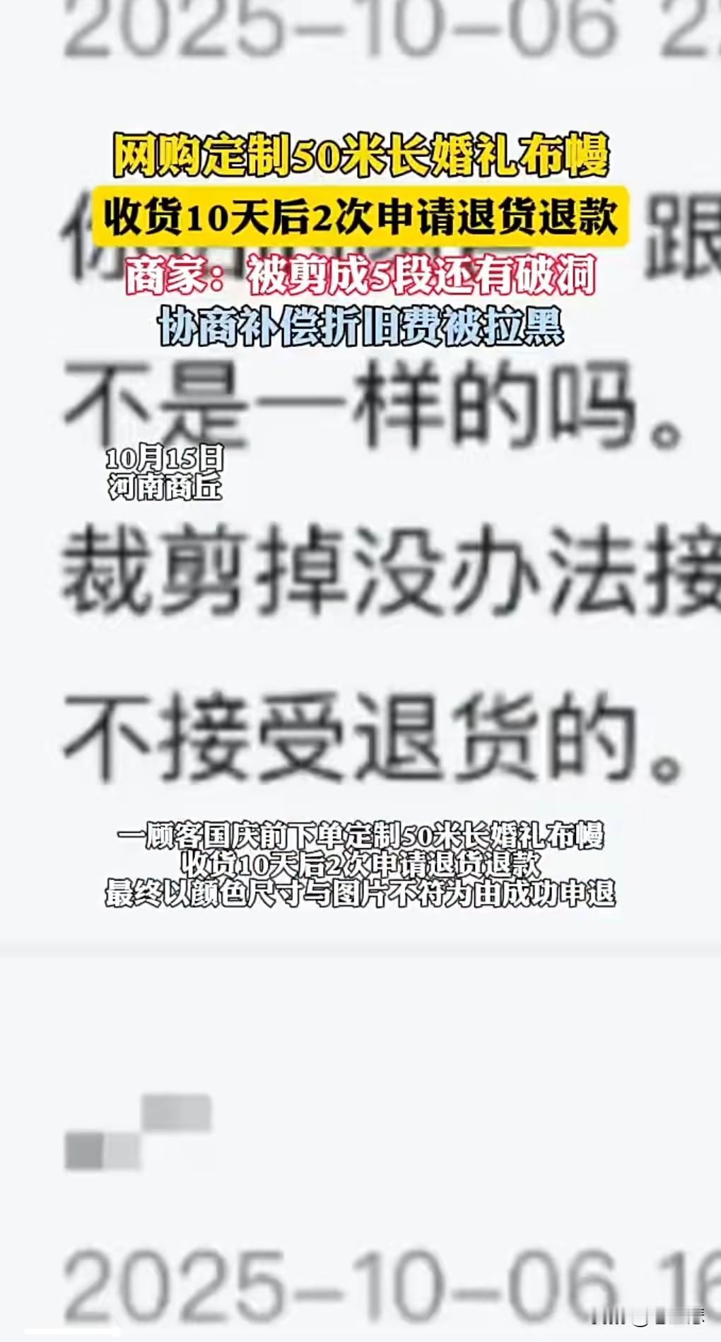 究竟是人性的泯灭,还是道德的沦丧? 如果想退货的话,那么请保持商品的完整性。 有的顾客退货了,商家也同意了,但是退的是损坏的商品。 这可就说不过去了。 这怎么好意思退货的? 10月19日(发布)。 顾客网购50米婚礼布幔,退回破布。 布幔被剪成五段,还有破洞。 这退回去了,商家也无法再卖了,商家的损失,顾客肯定是要赔偿的。 顾客网购婚礼布幔 退回破布