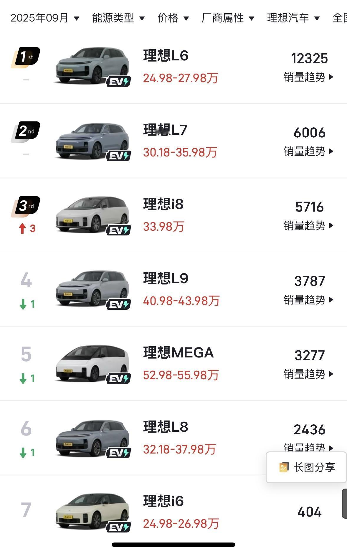 理想汽车9月各车型销量如下👇🏻 1、理想L6——9月销量12325辆 2、理想L7——9月销量6006辆 3、理想i8——9月销量5716辆 4、理想L9——9月销量3787辆 5、理想Mega——9月销量3277辆 6、理想L8——9月销量2436辆 7、理想i6——9月销量404辆