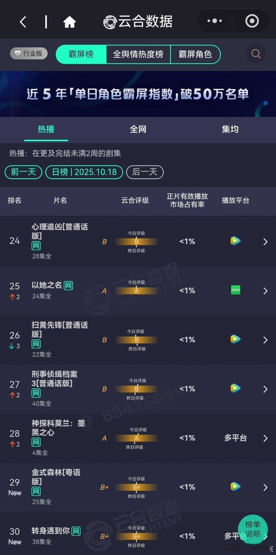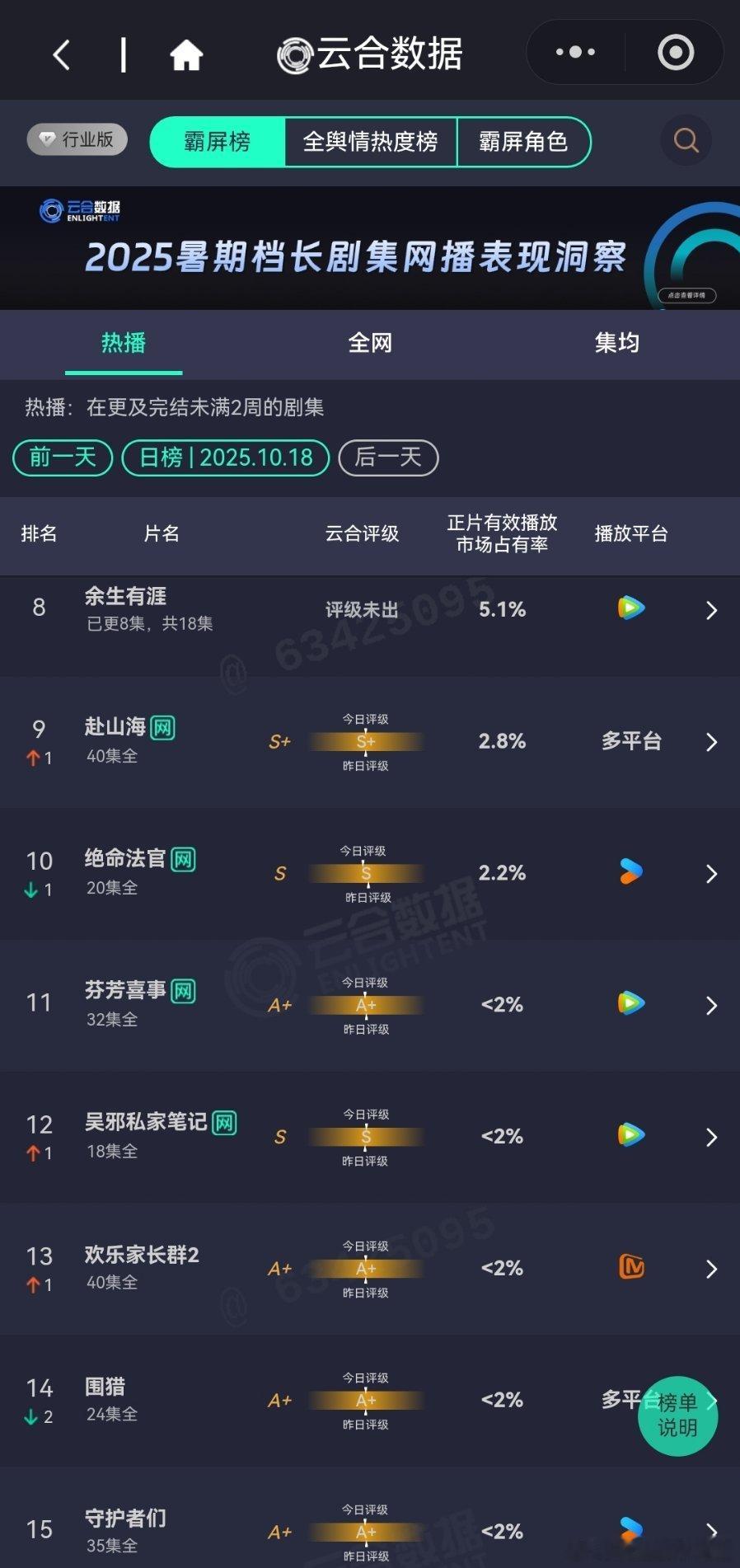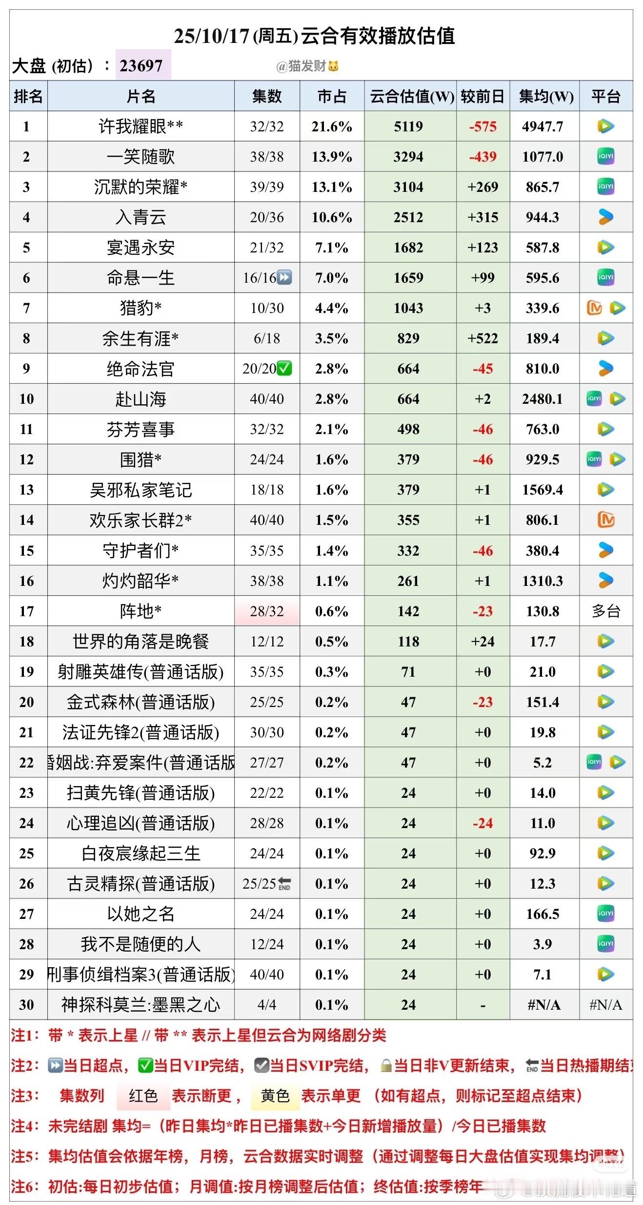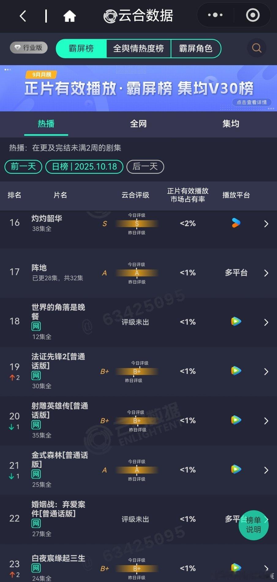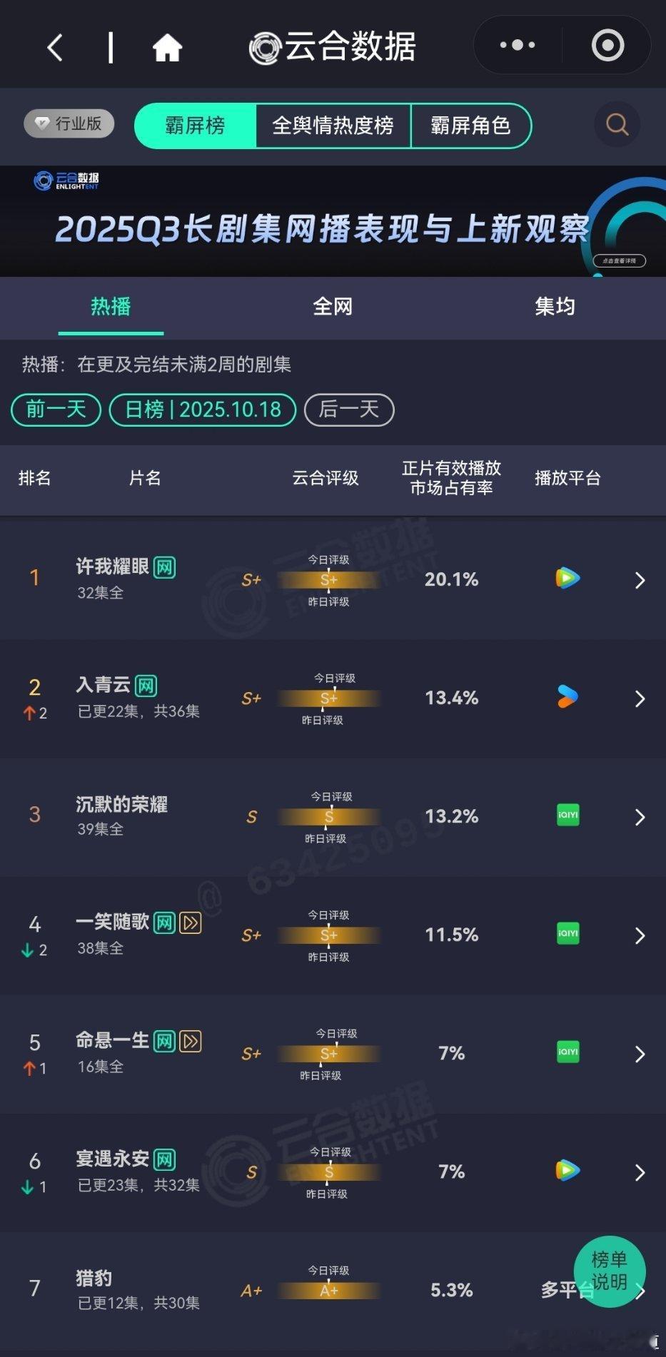 10月18日云合播放占比云合许我耀眼20.1%还蛮能苟的,趋势很好入青云13.