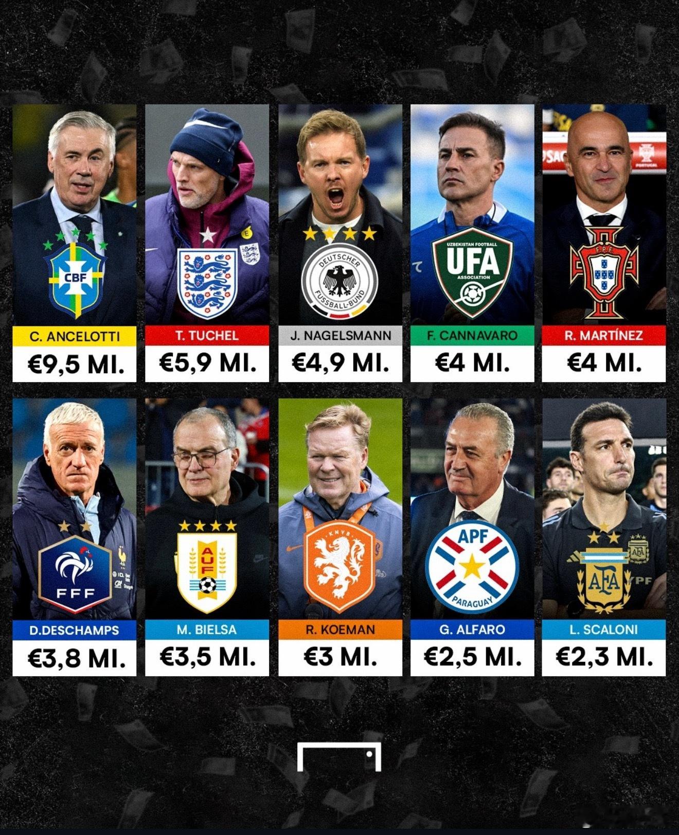 而伴随着曼奇尼的下课,他的意大利同乡、巴西队主帅安切洛蒂以950万欧成为全世界国家队主教练里薪水最高的一位。英格兰队的图赫尔以590万欧排第二,德国队纳格尔斯曼 以 490万欧排第三,卡纳瓦罗 以400万欧排第四,葡萄牙马丁内斯 400万欧第五,法国队德尚380万欧第六,乌拉圭贝尔萨 350万欧第七,荷兰科曼 300万欧第八,巴拉圭阿尔法罗 250万欧第九,世界杯卫冕冠军阿根廷主帅斯卡洛尼 230万欧第十。