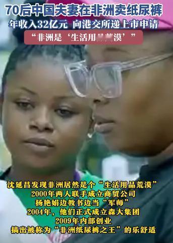 人怎么能聪明成这样?10月17日报道70后学霸夫妻从哈工大毕业后,没继续深造,也没随便找个工作,而是一咬牙跑去非洲,靠卖纸尿裤赚了32个亿,都要准备上市了! 10月11日,广州的秋阳里,加纳贸易部长的到访格外引人注目。 这位远道而来的部长直奔森大集团总部,只为和一家中国企业深谈投资合作。 这家企业旗下,藏着被称为“非洲纸尿裤之王”的乐舒适,而它的掌舵人,是一对从哈工大走出来的70后学霸夫妻。 更令人惊叹的是,这家靠纸尿裤起家的公司,今年8月刚二次递表港交所冲击IPO,2024年营收已达4.54亿美元(约合32亿元人民币)。 这对夫妻究竟藏着怎样的智慧,能在非洲大陆把一片纸尿裤做成百亿生意? 故事的起点,藏在二十多年前的选择里。 沈延昌和杨艳娟从哈工大毕业后,本握着人人羡慕的“铁饭碗”:沈延昌在外企做高管,年薪几十万。 杨艳娟更成了华南理工大学的副教授,站在高校讲台上教书育人。 可每天重复的会议和PPT,让两人总觉得“像颗高级螺丝钉,不知道自己到底创造了什么”。 1997年,沈延昌被公司派驻尼日利亚,这段沾满疟疾与汗水的经历,意外掀开了命运的新页。 在尼日利亚的超市里,他亲眼见过进口纸尿裤标价相当于当地家庭一周的生活费。 而更多妈妈只能用厚重的棉布,孩子闷得红屁股溃烂,洗尿布的水在盆里堆成小山。 这里缺好用又便宜的纸尿裤,这个念头像星火般烧起来。 2000年,夫妻俩咬咬牙辞了职,在广州租了个小办公室,从帮尼日利亚供应商采购货物起步,悄悄埋下创业的种子。 没人想到,这颗种子要在非洲的土壤里熬十几年才开花。 2009年,乐舒适作为森大集团的业务分部正式诞生,可初入非洲市场就撞了墙。 黑皮肤的妈妈们看着黄皮肤的陌生人递来的纸尿裤,眼神里全是怀疑。 沈延昌带着团队背起样品包,钻进尼日利亚的贫民窟和加纳的乡村,用蹩脚的当地语言加手势比划,把纸尿裤免费塞到妈妈们手里。 有位肯尼亚妈妈试用后专程找到他们,指着孩子干爽的屁股连连点头,这份口碑成了最有力的广告。 然而真正的考验在建厂时到来,2018年,为避开高额关税,夫妻俩决定在非洲本地生产,沈延昌彻底变了个人。 曾经坐办公室的高管,白天在工地和工人一起搬设备、拧螺丝,手掌磨出厚茧;晚上挤在临时板房里,对着设备图纸熬到深夜。 杨艳娟则一头扎进后勤堆里,跟当地政府谈政策、给工人做培训,肤色晒得和当地人没两样。 更关键的是产品改造,他们发现非洲宝宝体型壮实,就把腰围加宽2厘米;知道当地缺电没烘干机,就把吸水量提高30%,让一片纸尿裤能顶到天亮。 2024年,乐舒适的纸尿裤单片只卖8.29美分(约0.59元),比国际品牌便宜一半还多。 那些沾满汗水的试用装,慢慢长成了非洲市场的“硬通货”。 招股书数据显示,2024年乐舒适在非洲婴儿纸尿裤和卫生巾市场销量双双登顶,份额分别达20.3%和15.6%,光是纸尿裤就卖了41亿片。 在加纳、肯尼亚等6个国家,货架上最显眼的永远是它的品牌。 业绩一路飙升:2022到2024年,净利润从0.18亿美元冲到0.95亿美元,增幅超五倍,即便是2025年前四个月,营收仍保持15.5%的同比增长。 亮眼的业绩推着乐舒适踏上IPO之路,可这条路并不平坦。 2025年1月首次递表港交所后,因未及时更新财务数据,招股书在7月失效。 但夫妻俩没气馁,8月就带着最新数据二次递表,中金、中信证券等三大机构联合保荐,足见市场信心。 招股书里藏着隐忧:98.2%的收入来自非洲,2023年加纳塞地贬值让公司亏了1811万美元;宝洁等巨头也在非洲建厂,成本降了15%。 可加纳部长的到访给出了答案,该国启动“24小时经济计划”,承诺给乐舒适新厂税收优惠和土地支持,盼着它带动当地制造业。 如今站在IPO门前,这对夫妻的“聪明”终于有了答案。 不是靠投机取巧,而是把哈工大教的“解决问题”的学霸本事,用到了最接地气的地方。 研究宝宝体型调整产品,跟着工人拧螺丝降成本,蹲在村口听妈妈们的需求。 他们的工厂在非洲创造了1万个直接就业岗位,让上千万宝宝告别红屁股,更让“中国造”在异国他乡有了温度。 从放弃铁饭碗闯非洲,到带着32亿营收冲刺IPO,沈延昌和杨艳娟用二十年证明。 真正的聪明从不是走捷径,而是用知识啃硬骨头,让商业价值长出社会温度。 这片曾被视为“蛮荒”的土地上,他们种下的不仅是生意,更是中国企业出海最生动的样本。 信息来源:红星新闻2025-10-17发布:70后学霸夫妻非洲卖纸尿裤,年收入32亿元!二人毕业于哈工大,男方被派去非洲时发现是“生活用品荒漠”
