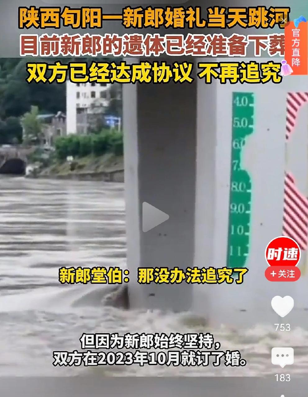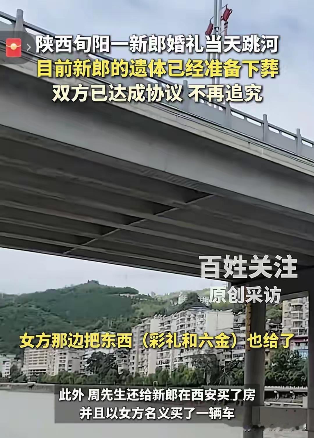新郎跳河最新进展: 新郎家放弃追究新娘方责任,新娘退还彩礼 新郎堂伯周先生告诉记者: 双方商定已经达成协议; 女方退回彩礼及六金,合计18.8万元; 新郎父亲放弃追究新娘的责任; 遗体拉回来,放在坡上准备下葬; 新郎一家子很老实很善良啊! 新郎离世半月有余,按照我们陕南的习俗,必须下葬,让逝者入土为安。 这可能也是新郎父亲放弃追究女方责任的原因。 新娘及家人,应该从此事中吸取教训。婚姻,不是买卖! 做人做事,还是善良点! 希望,新娘能够遇到良人 新郎父母节哀顺变[祈祷][祈祷][祈祷] 新郎跳河 陕西婚礼跳河 婚礼小伙跳河 视频转图文大赛