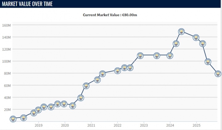 本赛季福登代表曼城各赛事出战13场比赛,贡献5粒进球和3次助攻。目前25岁的福登德转身价为8000万欧元,而在2024年同期,正值巅峰的福登最高身价曾达到1.5亿欧。在过去的1年时间里,福登的身价下跌了7000万欧元。