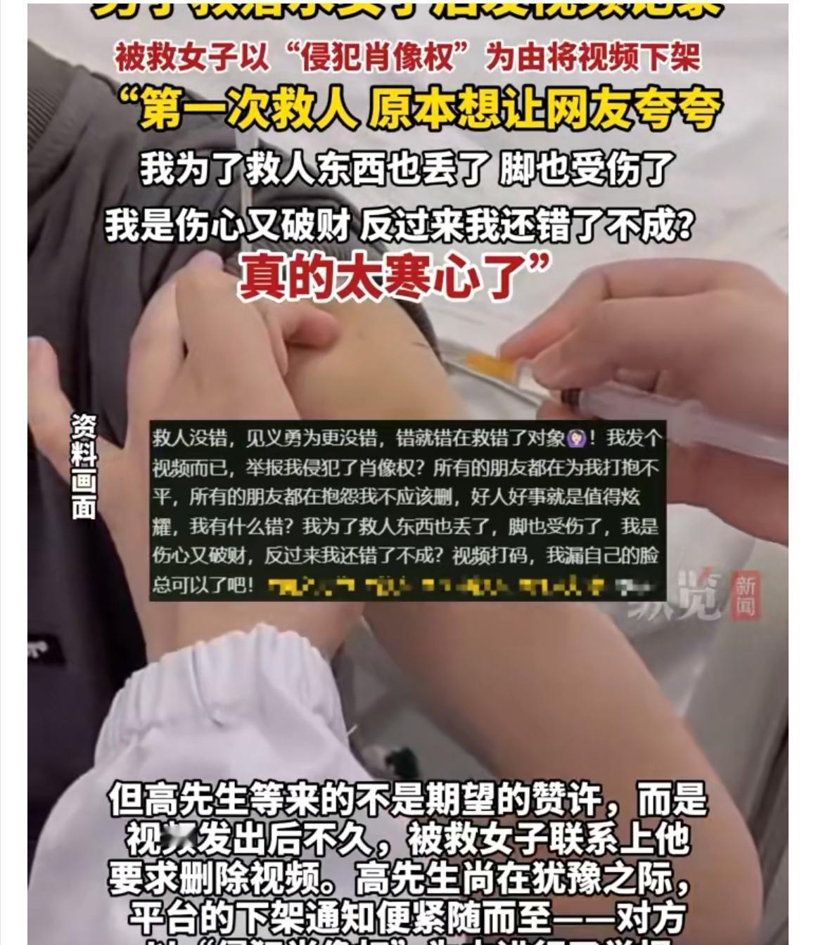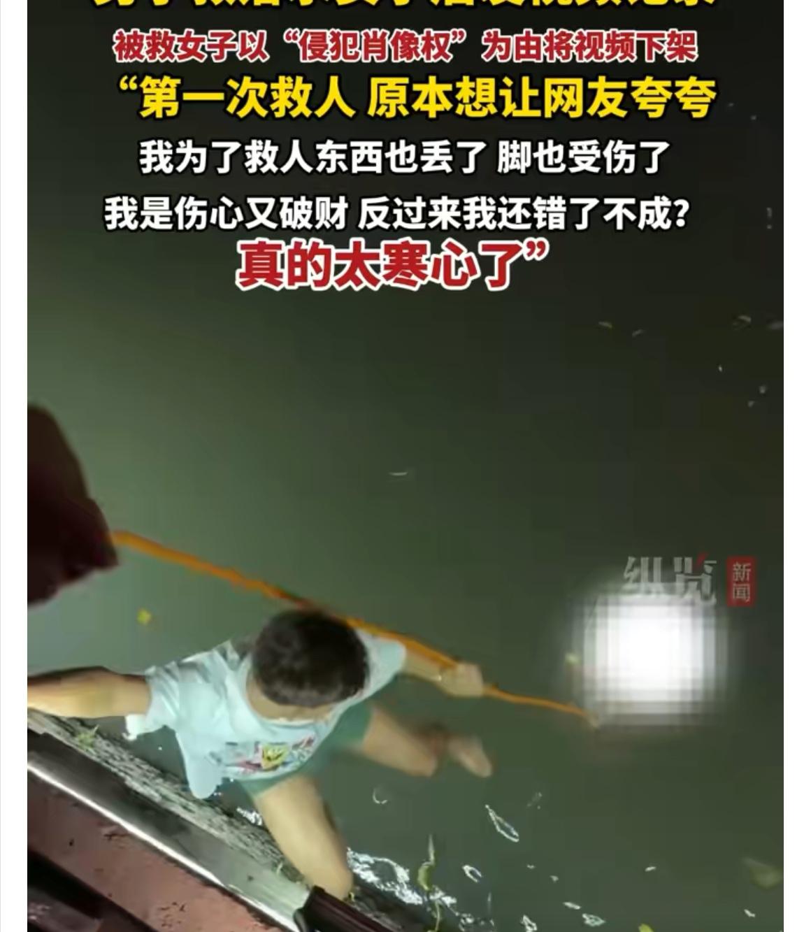 【救人反被“举报”?男子跳河救人发视频,女子称侵犯肖像权要求下架】 近日,浙江杭州发生了一件让不少网友感到唏嘘的事:10月14日晚,高先生在路边看到有人落水,毫不犹豫地跳进河里将女子救上岸。本以为这是“正能量”满满的英雄事迹,结果剧情却有了意想不到的反转。 原来,高先生因为是头一次救人,心情激动之下就在社交平台分享了现场视频,想着博得大家一句“好样的”。谁知没多久,被救的女子竟然联系上了高先生,要求他把视频删掉。理由很简单——她觉得自己的肖像权受到了侵犯。高先生还没反应过来,网络平台就收到了女子的举报,以“侵犯肖像权”为由火速将视频下架处理。 这事一出,不少网友议论纷纷。不少人支持高先生觉得好人难做,也有人理解女孩想保护隐私的诉求。这起事件也让大家再次关注到“肖像权”的话题:即便是助人为乐,也要注意尊重他人的个人权益。看来,在自媒体时代,我们每个人都是信息传播者,分享正义时也要学会守住“分寸线”。 那么你怎么看?要不要在救人的同时也问一句:“可以拍照发视频吗?”