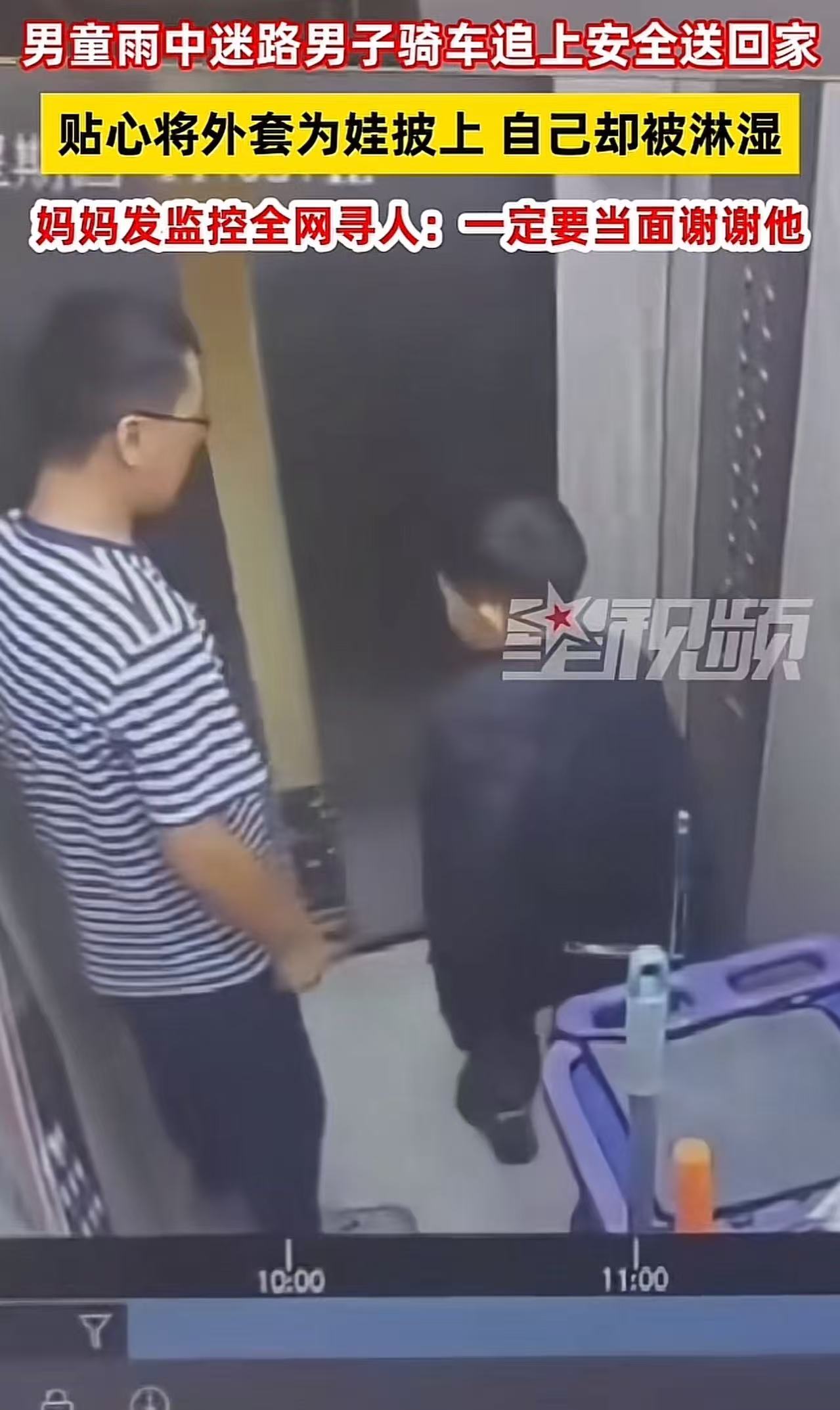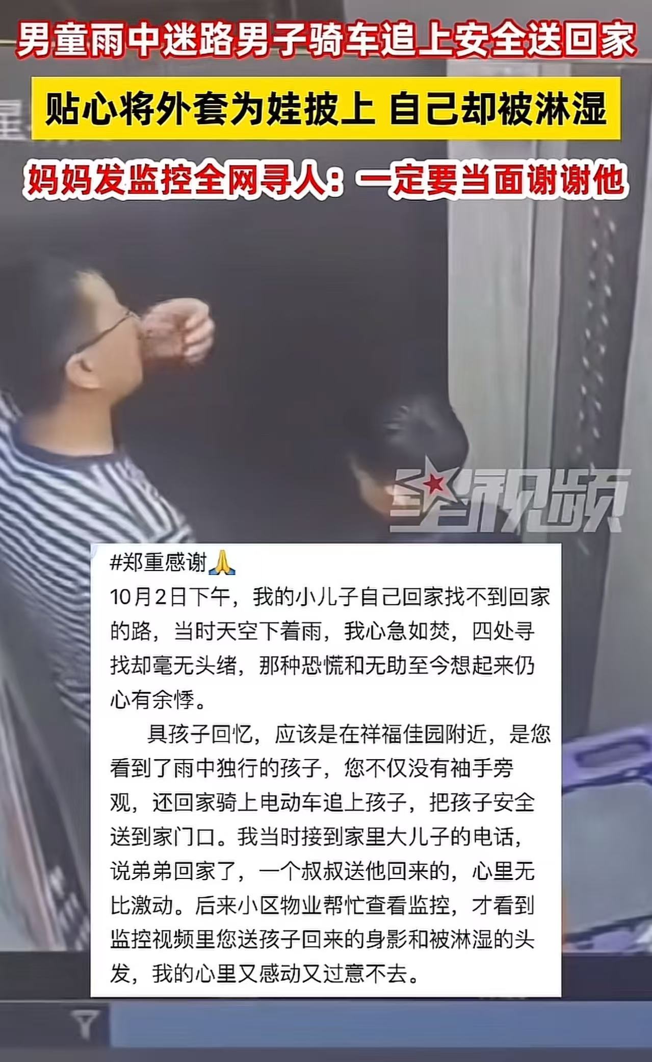 为了找到这位恩人当面感谢,母亲赶忙跑到物业查看监控。当她看到监控画面里,男子全身都被雨水淋得湿透,却依然细心地把外套给孩子披上,然后小心翼翼地护送孩子回家的场景时,她的泪水再也忍不住了,夺眶而出。