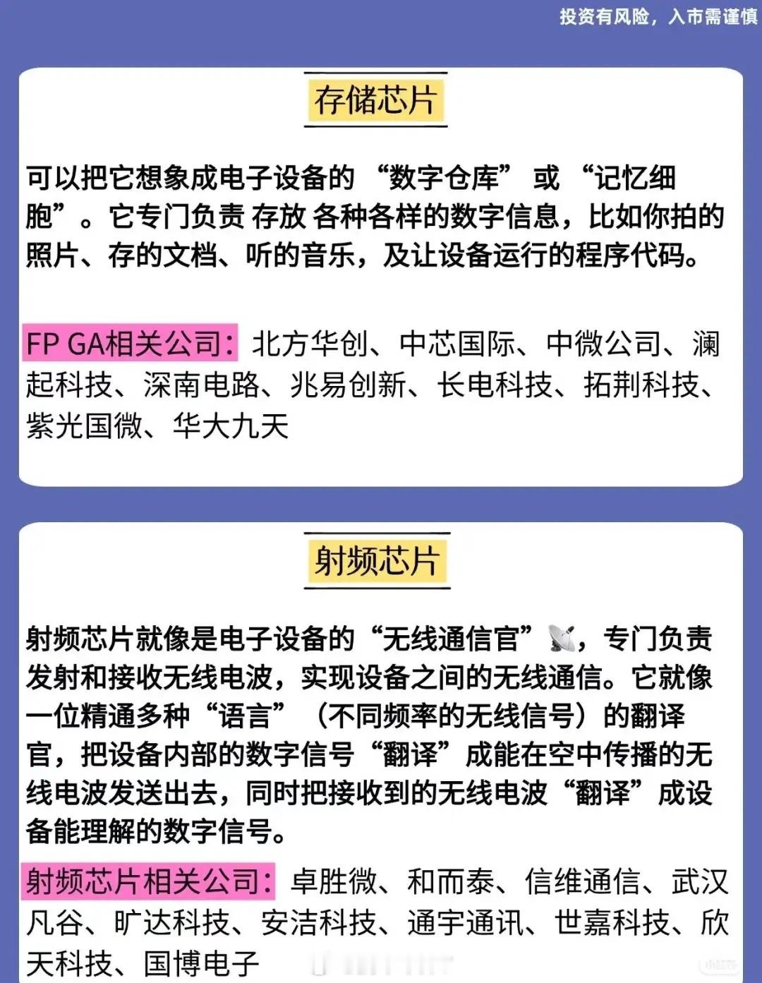 5. 存储芯片:如同电子设备的“数字仓库”或“记忆细胞”,用于存储照片、文档、程序等数据,相关公司如兆易创新、澜起科技、长电科技、紫光国微等。