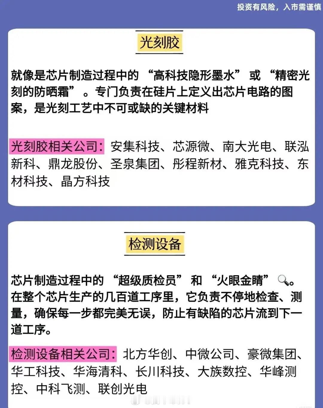 13. 光刻胶:是光刻工艺中的“高科技隐形墨水”或“精密光刻的防晒霜”,用于定义芯片上的微细电路图案,相关公司包括安集科技、南大光电、雅克科技、晶方科技等。