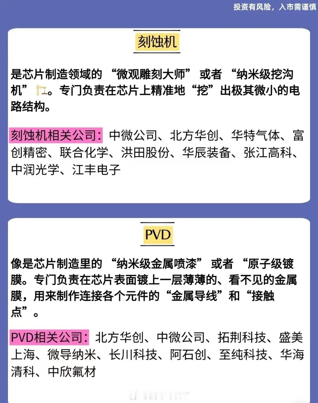 11. 刻蚀机:是芯片制造中的“微观雕刻大师”,负责在芯片材料上精准刻画电路结构,相关公司包括中微公司、北方华创、华特气体、江丰电子等。