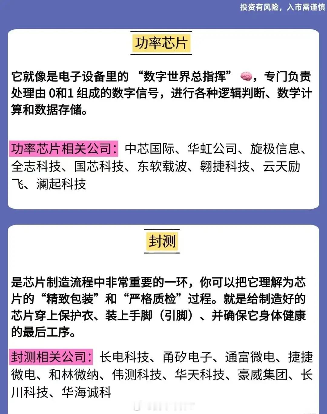 10. 封测(封装与测试):是芯片制造后期的“精致包装”和“严格质检”环节,确保芯片性能与可靠性,相关企业有长电科技、通富微电、华天科技、甬矽电子等。