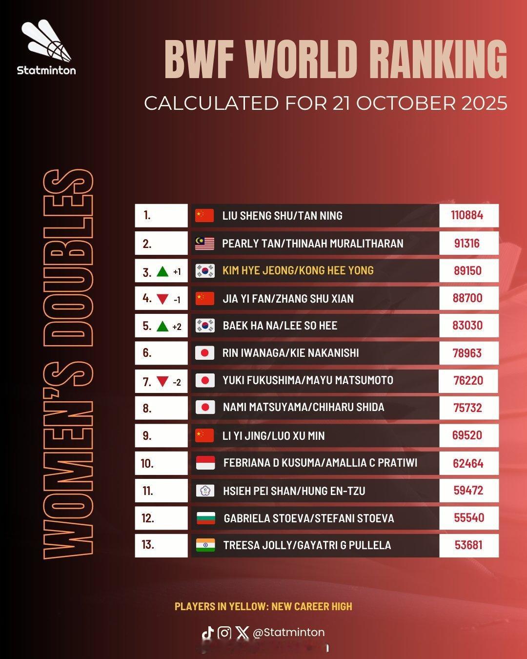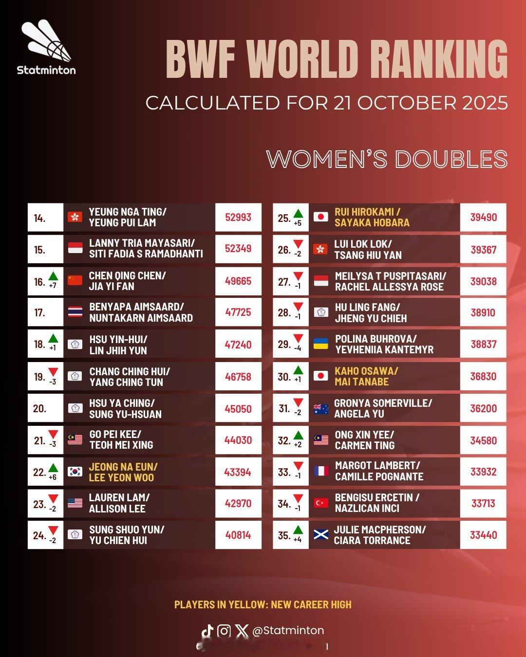 羽毛球🏸【女双】最新世界排名|总决赛积分排名