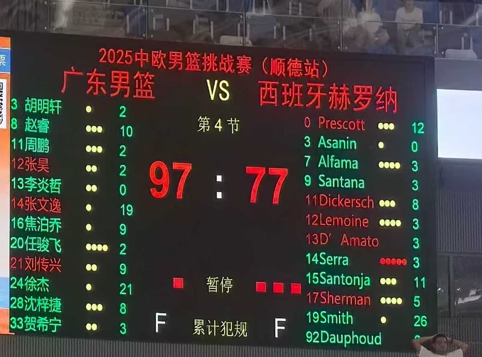 这场比赛是在佛山顺德举办的,对手是一支西班牙的球队,这场杜锋调整了首发,赵睿、胡明轩、贺希宁三后卫搭档,内线是周鹏和沈梓捷,其实开场广东的外线手感不好,但是防守端强度还是上的很大的。第二套阵容由徐杰带队,这组反而打得更加高效,徐杰、张文逸外线连续发炮,徐杰第一节末还命中压哨三分球,广东半场领先25分。