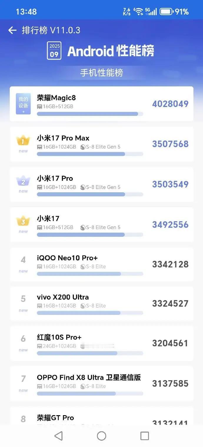 同样搭载骁龙8至尊版Gen5,谁的跑分更胜一筹?一目了然。 有趣的是,此前荣耀