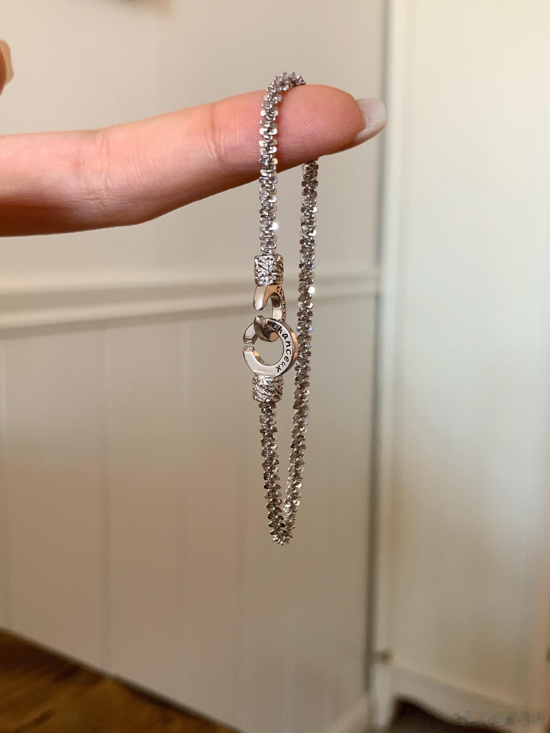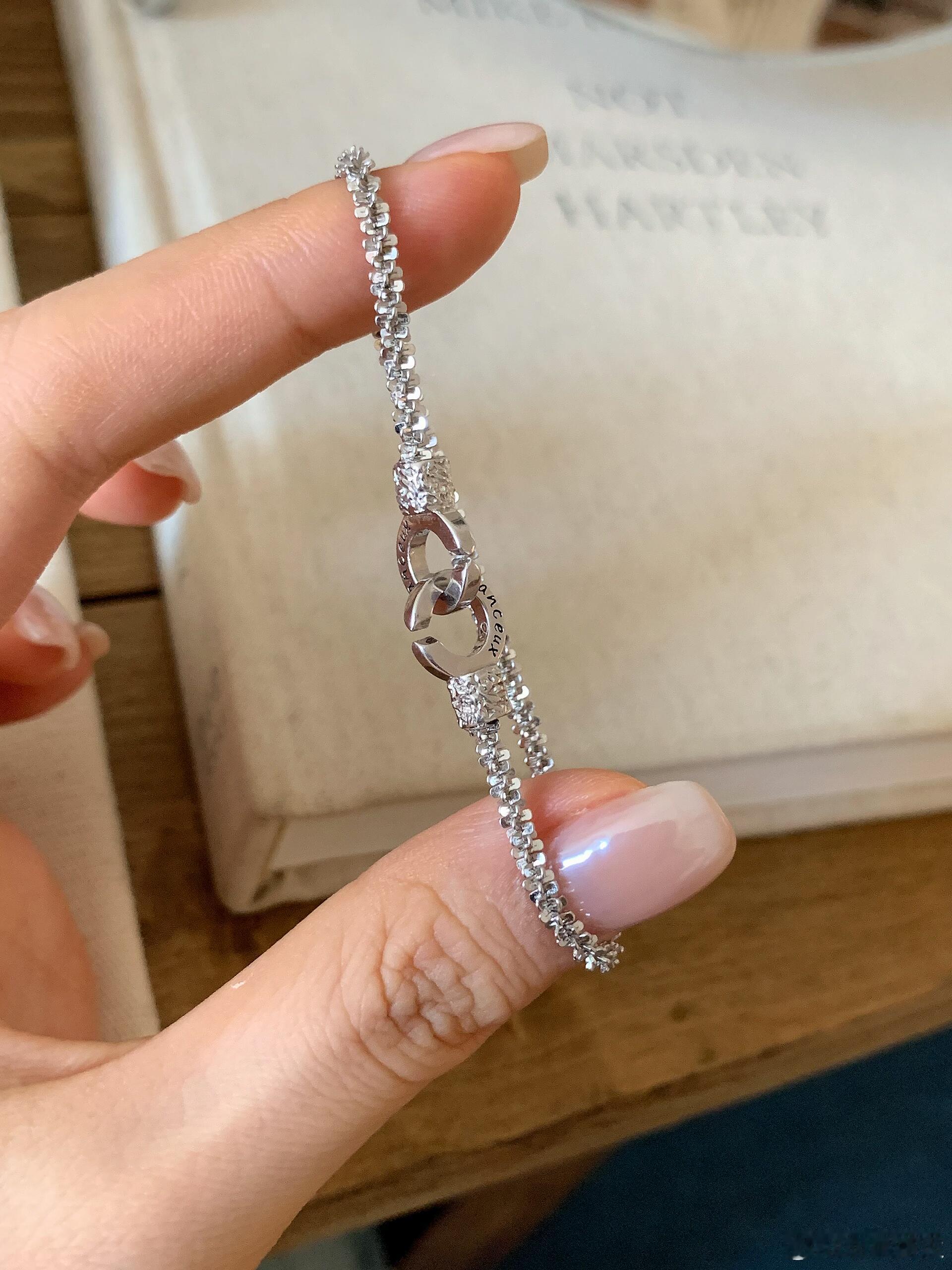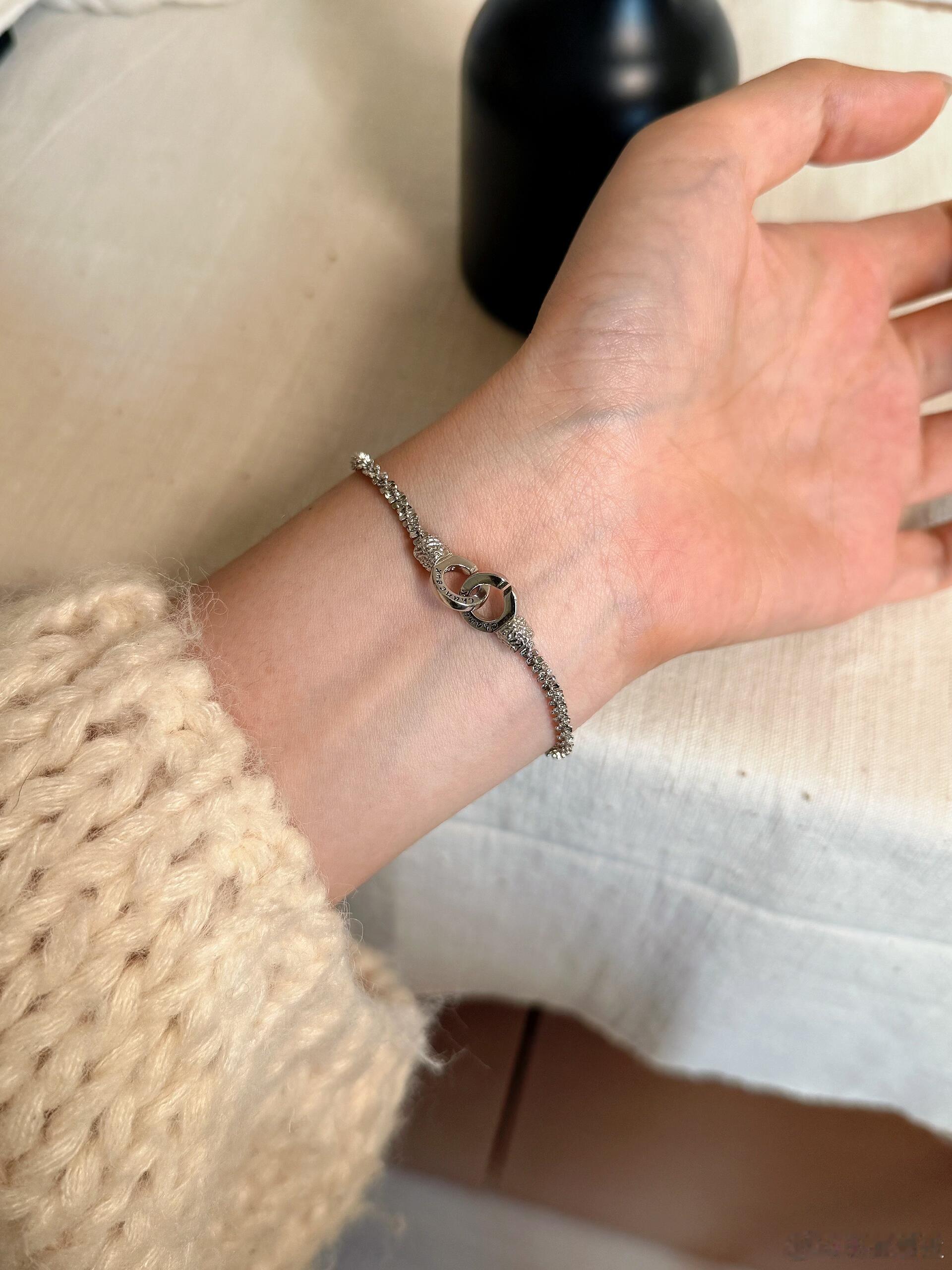 这款银色手链以精致编织的多股细链构成主体,泛着柔和金属光泽,佩戴时轻盈贴合手腕。其标志性设计在于中央的双环相扣结构,两个圆环边缘密镶璀璨碎钻,交织处折射出夺目光彩,巧妙平衡了简约与华丽。手链或搭配独特的心形雕刻卡扣,增添细节辨识度;整体风格细腻优雅,无论是单独佩戴还是层叠搭配,都能在米色针织面料的衬托下,为日常造型注入一抹不动声色的高级感。时尚配饰