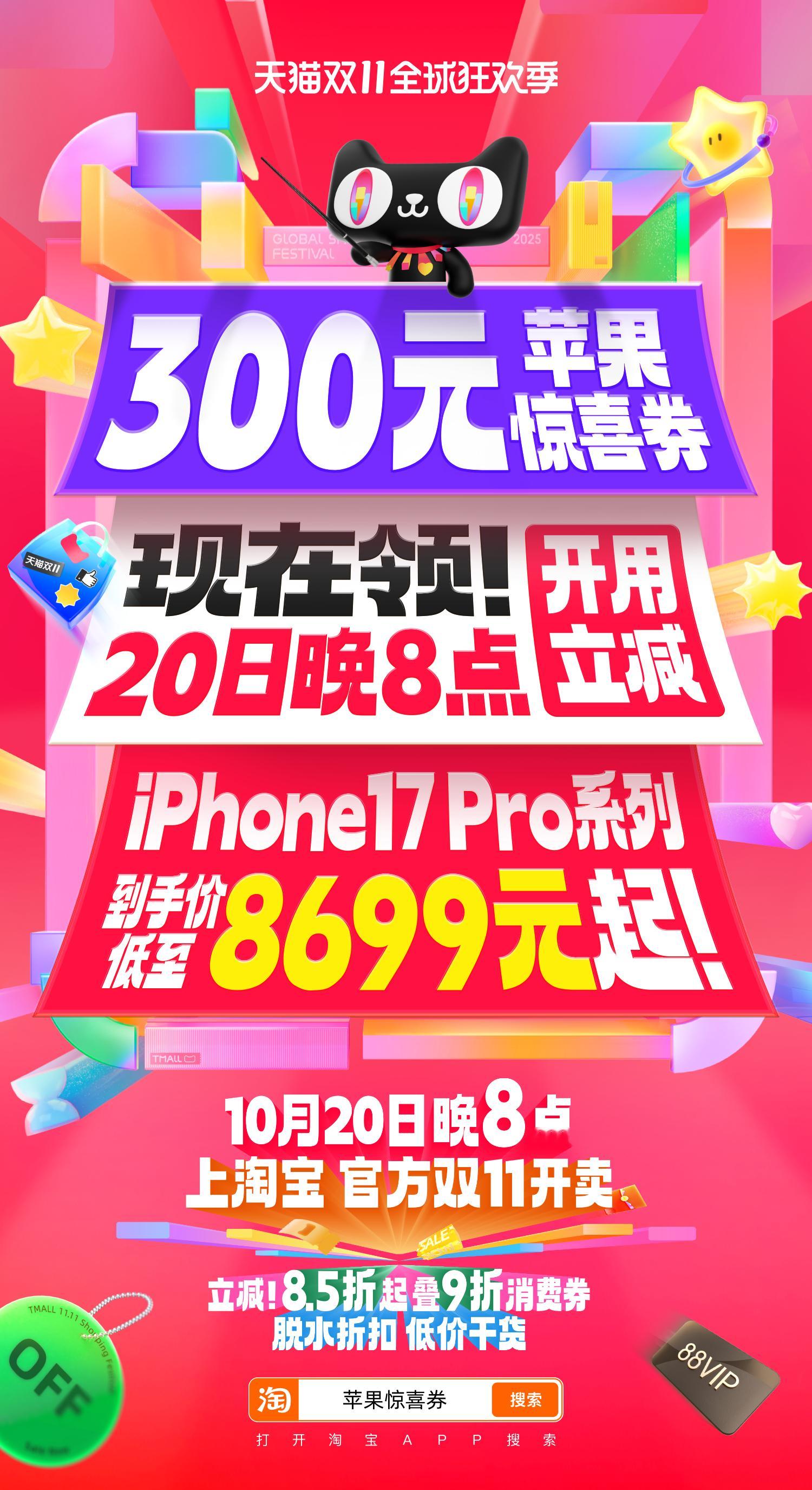 天猫双11才是真优惠天猫双11 双11买苹果17要优惠?天猫会出手!晚8点天猫iPhone17Pro优惠300元 盼星星盼月亮,可算是把苹果惊喜券盼来了!iPhone17Pro系列300元苹果惊喜券现在直接领,今晚20点开用!到手价低至8699元起!天猫官旗再叠12期免息,正品划算又安心!天猫双11国补低至5折今晚8点天猫买iPhone17历史最低价