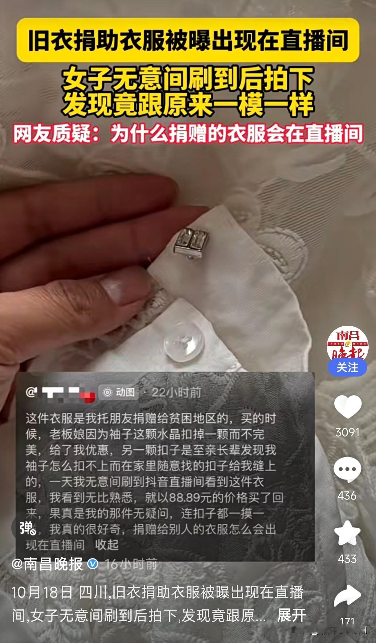 好心人的天塌了!一女子在直播间刷到一件衣服竟然是自己十年前捐到贫困山区的。 为了确认自己没有看错,还特地花了59元把这件衣服拍了回来。 收到货经辨认,还真是自己捐出的衣服,因为有个纽扣是她自己缝的,印象特别深。到这不由得让她困惑了,这是她捐给贫困山区的衣服,怎么会出现在直播间,并且上架出售,难道捐赠衣服没送到贫困山区的人手里? 评论区很多人有类似经历,还有网友说当地公益回收旧衣服,旧衣服被放在仓库,后来被回收商低价处理,质疑公益不真实。 也有网友分享到,自从之前有搜到过这样的事情,就不再捐赠衣物,要么直接捐赠,不经过第三方,要么都扔垃圾捅了!!不然还真说不定哪天自己花钱买的衣服都是别人扒拉下来的旧衣服,换谁谁不膈应!! 对此,你有什么看法,欢迎在评论区讨论