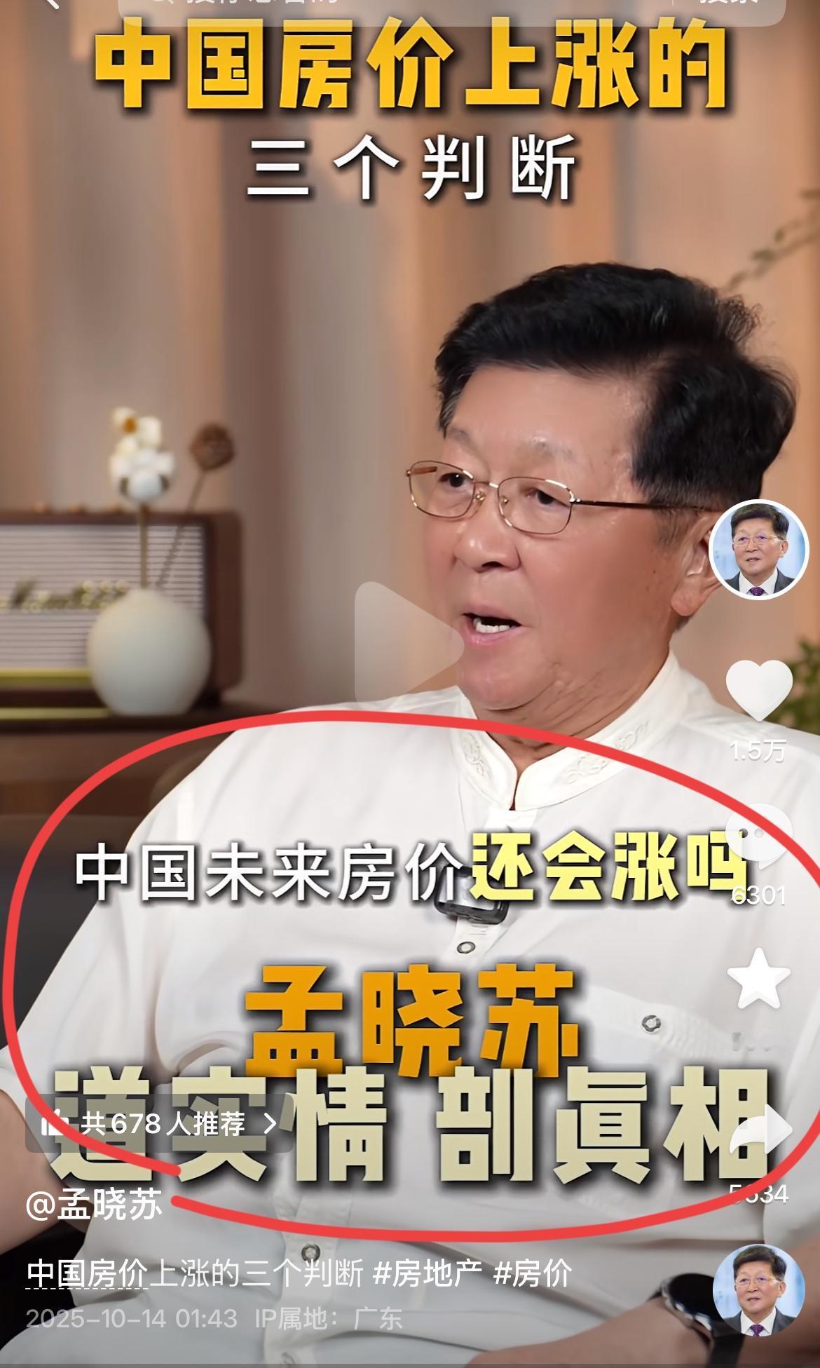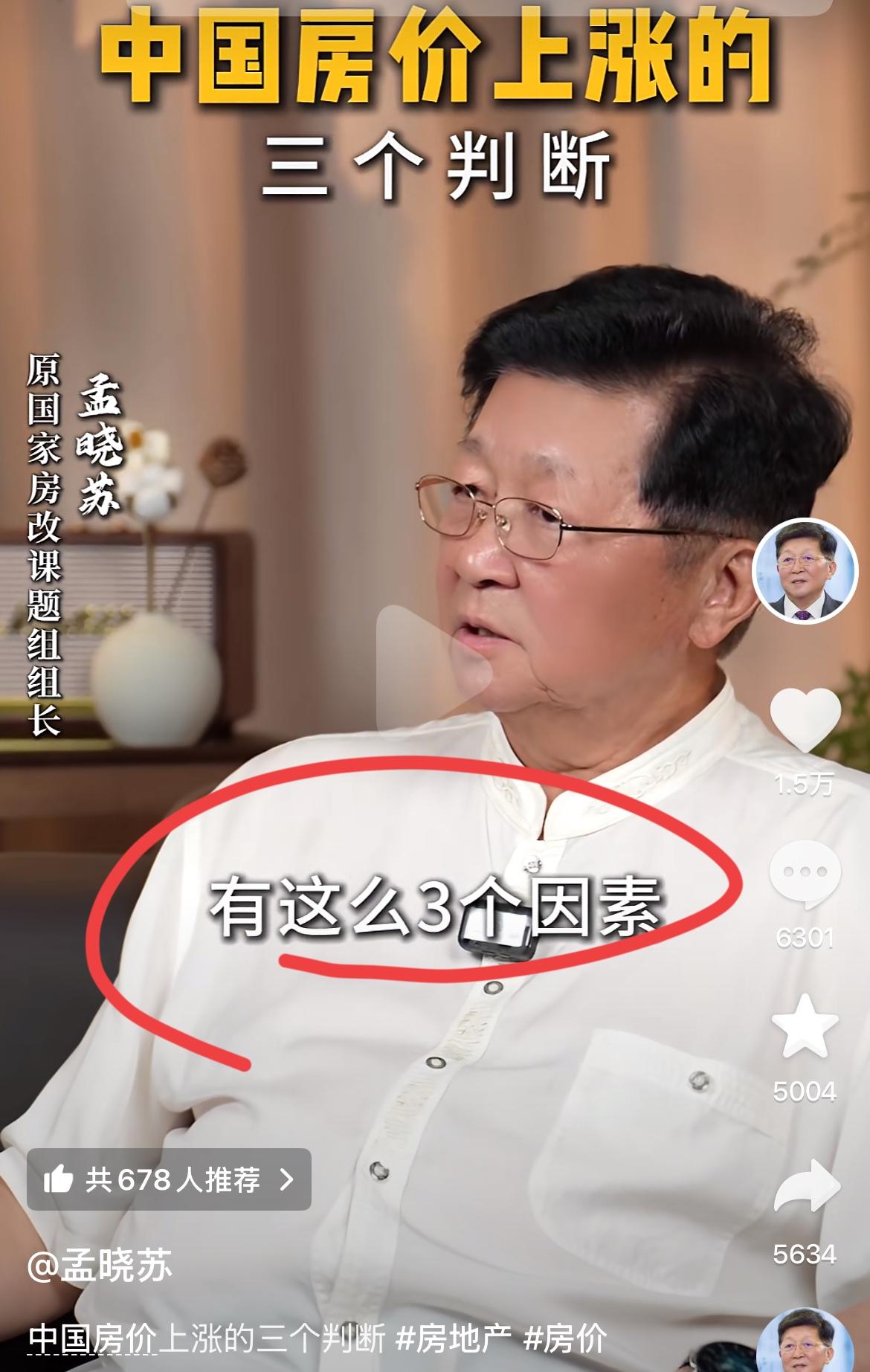 房价还会涨吗? 著名经济学家,房地产专家,孟总告诉你,还会继续涨~ 因为有三大因素在起作用,决定了房地产要继续涨~ 孟总也提出了关于房地产分析的框架这个框架也是分析三个因素! 此前,著名经济学家任泽平也曾提出了一个著名的分析框架; 也是三个因素,那就是长期看人口,中期看土地,短期看金融~ 不过,这个分析框架被孟总升级了~ 对于人口下降,会造成房价下降,需求下滑的论调; 孟总进行了严厉的批判,他认为这种看法是严重错误的; 日本人口下降几十年了,房价却不断上涨,都难上涨了10多年了; 日本人口1.2亿,我们14亿,我们还有很大的人口红利可以吃。 啥意思呢? 本质上,房价上涨跟人口下降没有关系,我们还有很大发展空间和人口红利。 孟总表示,只要有三大因素,就会促使房地产继续上涨。 1、短期看供求,这是最基本的逻辑。 目前房地产市场的需求还是很大的,只是信心不足,大家不敢出手,需求也压抑住了; 不是不想买房,是不敢买,只要涨起来,他们一定进场接盘,信心是主要问题。 2、中期看地价,这价格是刚性的,大城市占到总价的三分之二; 就算建好后房价下跌,地价也不能跌,这里面很重要的一点是; 这些是垄断的,不能降价,如果降价,土地抵押的地偿债就会出问题; 现在就算没人买,也不会降价,你可以不买,我不能降价。 不断拍卖,不断抬高价格,有示范作用,提升周围二手房价格;长期看,房价还是继续上涨。 3、长期看发钞。经济发展,必定要不断发钞。 我们现在的GDP140万亿,M2大概是280万亿; 这些货币不是进入日常消费的,而是进入到了投资和资产。 最终会体现到土地价格和房价上。 只要不断印钱,房价一定会上涨. 综合分析,短期房价会有波动,但长期看,一定是上涨的。 你怎么看孟总的观点,房价只能继续不断上涨么?