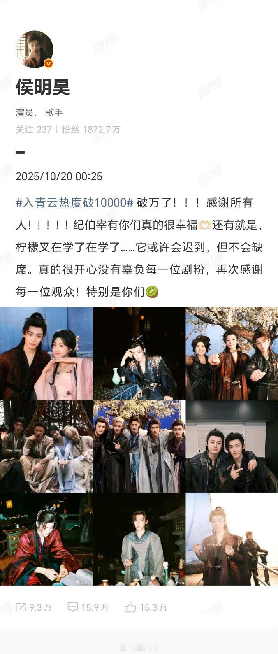 侯明昊发文回应入青云破万哈哈哈侯明昊柠萌叉在学了