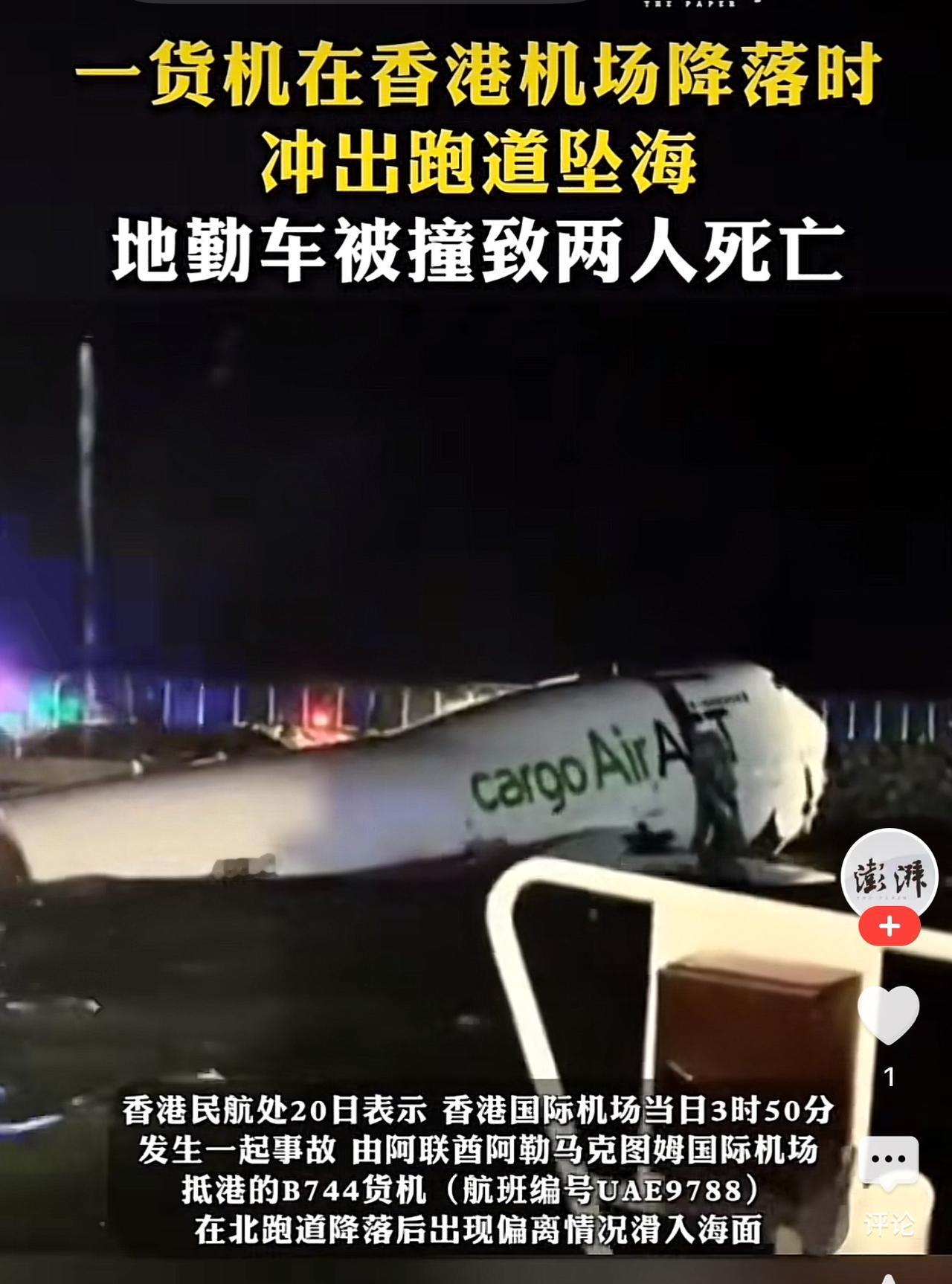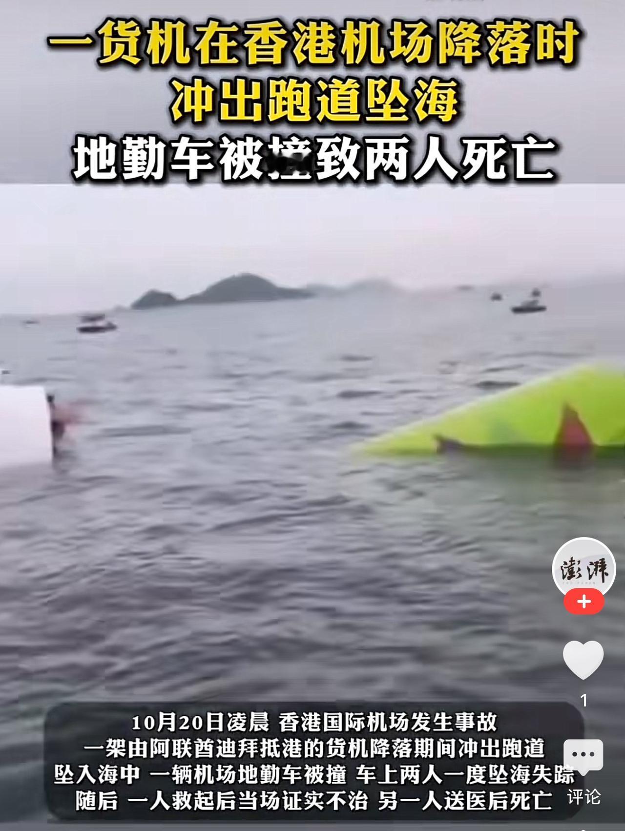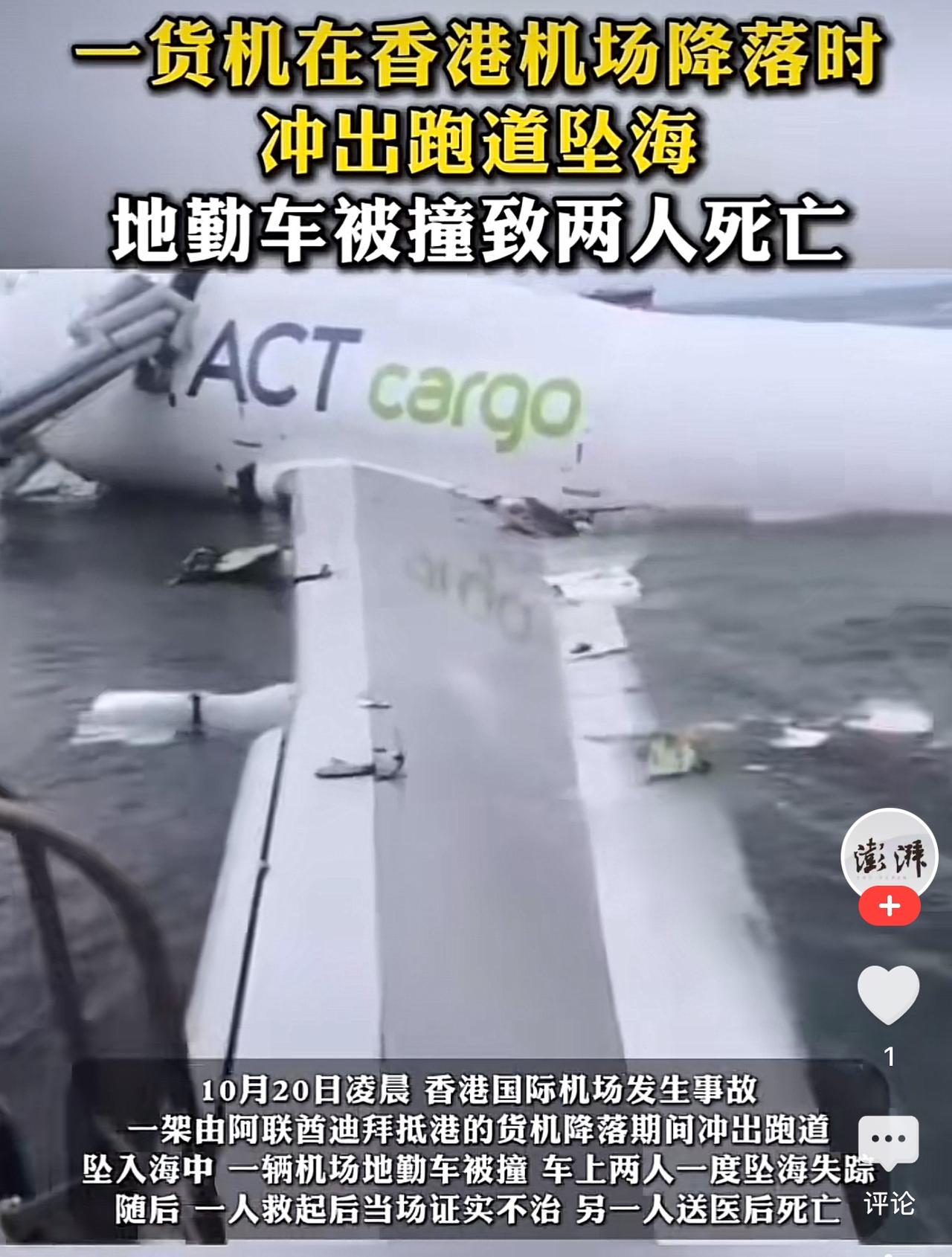 突发! 10月20日凌晨,香港机场一货机降落时冲出跑道,干海里去了。 两个地勤不幸身亡。 ……