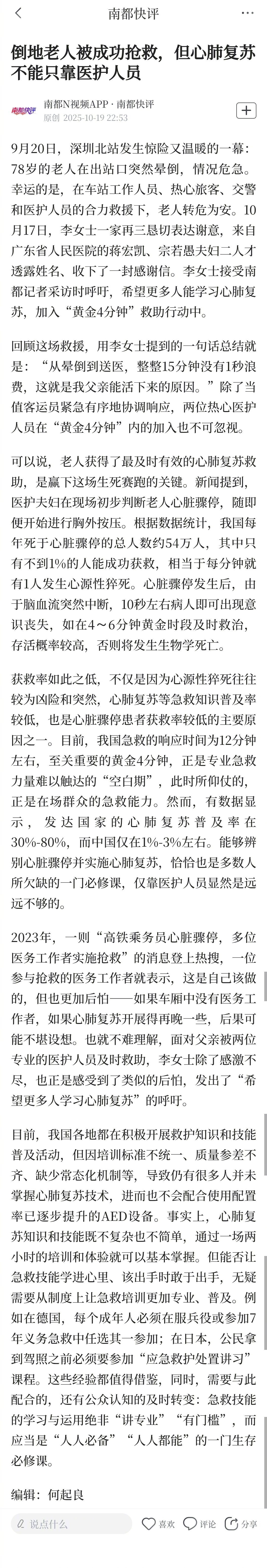 #急救技能运用绝非讲专业有门槛#【南都快评:倒地老人被成功抢救,但心肺复苏不能只靠医护人员】#学习急救技能是生存必修课#9月20日,深圳北站发生惊险又温暖的一幕:78岁的老人在出站口突然晕倒,情况危急。幸运的是,在车站工作人员、热心旅客、交警和医护人员的合力救援下,老人转危为安。10月17日,李女士一家再三恳切表达谢意,来自广东省人民医院的蒋宏凯、宗若愚夫妇二人才透露姓名、收下了一封感谢信。李女士接受南都记者采访时呼吁,希望更多人能学习心肺复苏,加入“黄金4分钟”救助行动中。