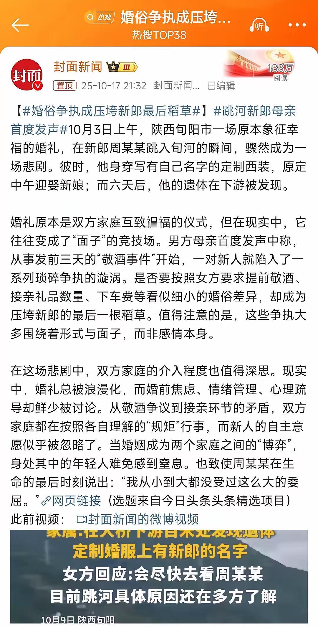 繁琐的婚俗程序,造成各种冲突和争执; 成为压垮新郎的最后一根稻草。 看到这样的信息,估计很多人都会害怕; 可以不客气地说,很多地方的各种繁文缛节; 也从另外一个层面造成了不婚不育,生育率低下。 结婚,这些习俗怎么说呢,说到底还能理解,毕竟人生大事嘛。 但要说到有些地方的白喜事,那就更加离谱了; 比结婚排场大多了,惊动全村人,全部人就要参加; ‘在外地工作的也要叫你回去参加。 要摆上好多天,全村天天吃席,一家人累得半死。 花几万,甚至十几万!! 这是什么,绝对的陋习! 建议全国取消土葬,一律实行火葬。 都什么年代了,人都死了,搞这些有何意义呢?