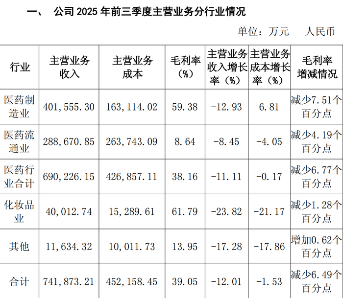 医药流通业实现收入28.87亿元,同比下降8.45%,毛利率为8.64%,减少4.19个百分点。