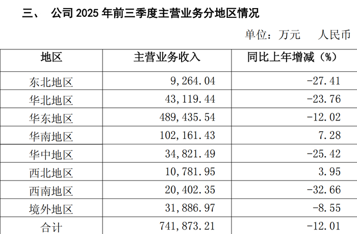 从地区表现来看,仅有华南(+7.28%)和西北(+3.95%)两个地区实现收入增长。而作为收入主要来源的华东地区,同比下降12.02%。西南(-32.66%)、东北(-27.41%)和华中(-25.42%)地区则成为下滑最为严重的区域。