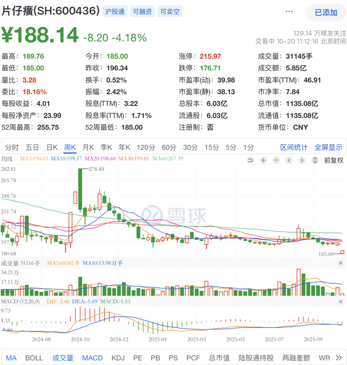 截至10月20日10:00,片仔癀(600436.SH)股价在188元附近震荡整理。该交易日股价较前一交易日收盘价196.34元明显低开,大幅下跌4%,市场在业绩公布后,仍在消化利空。此次业绩报告不仅是公司近二十年来首度出现前三季度营收、净利双降,也伴随经营现金流的恶化和库存高企,共同对股价形成压制。