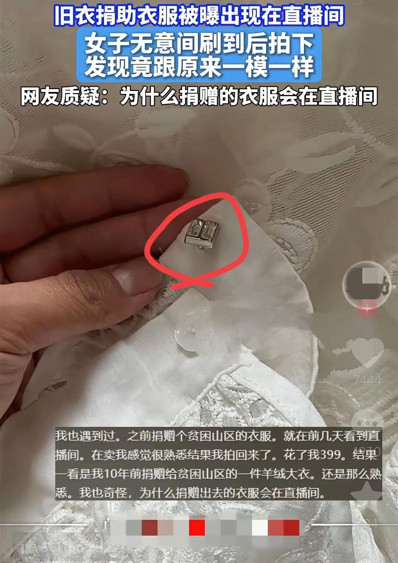 好心人的天塌了!捐给山区的衣服,竟被399元挂在直播间卖,这哪是公益,分明是“薅善良的羊毛”! 四川女子刷直播时,一眼瞅见件眼熟的羊绒大衣,那可是她十年前捐的——袖子上那颗自己补的水晶扣,就是铁证。为了确认,她咬牙买回,心彻底凉透。 评论区早炸了锅,有人说小区回收箱的衣服,被按件论价卖给回收商,牌子差的就堆成垃圾山。原来所谓“公益回收”,早成了生意:挑成色好的翻新卖,差的做工业原料,山区人根本见不着。 最寒心的不是衣服被卖,是善意被明码标价。当好心人宁愿把衣服丢垃圾桶,受损的从来不是需要帮助的人,而是整个社会的信任。 你遇过旧衣捐赠的糟心事吗?现在还敢随便捐衣服吗?评论区聊聊。