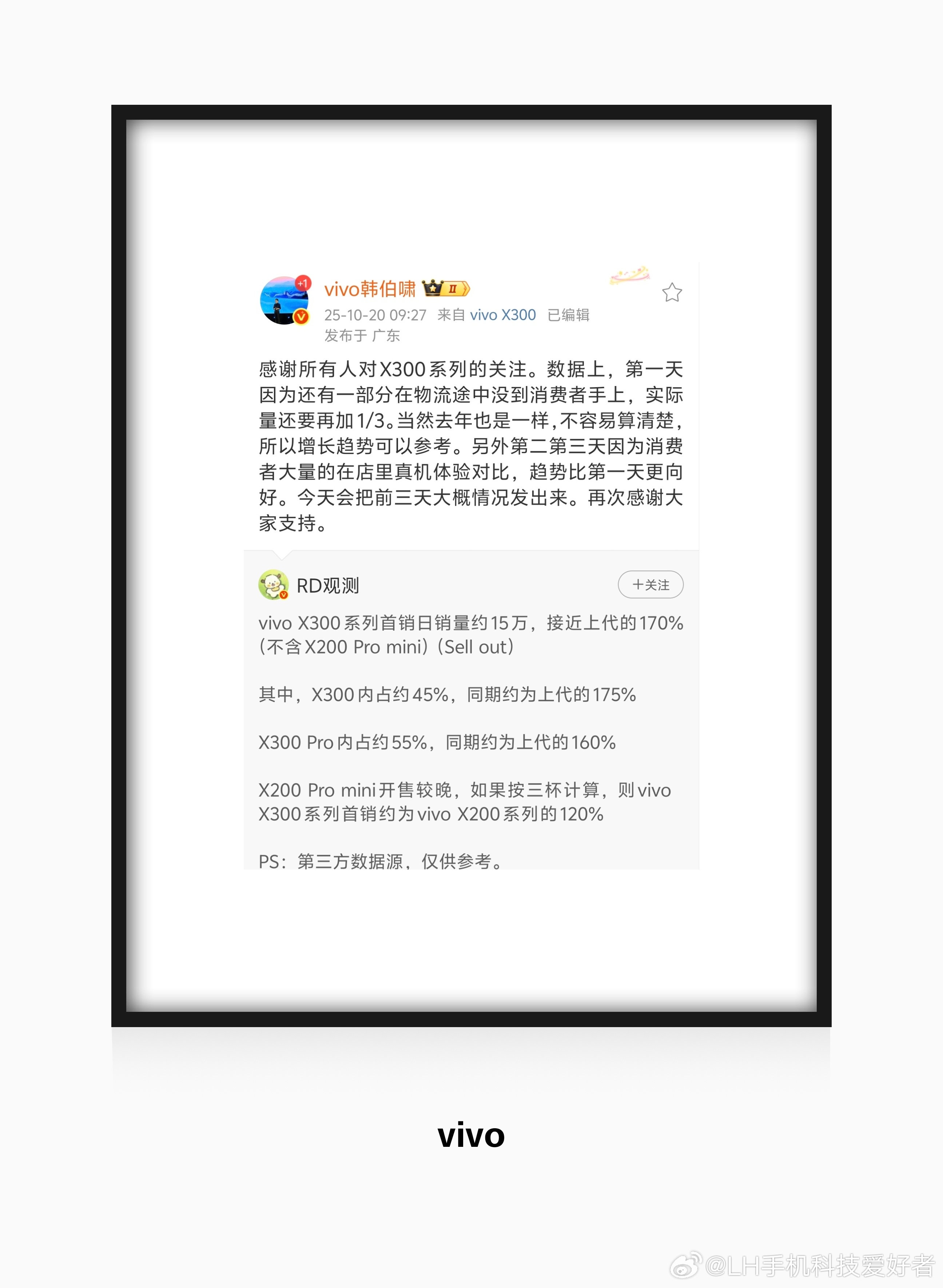 第三方数据显示,vivo X300系列首销当天销量应该在20万左右,vivo X300 Pro的占比更高一些。网上评价两极分化,大家可以自己推断一下具体数据。