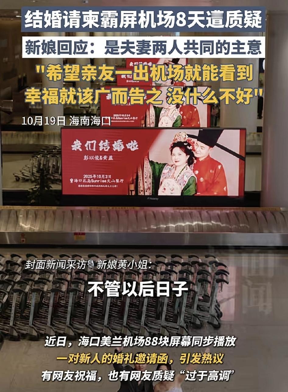 近日,海口美兰机场一对新人的邀请函在88块屏幕上,连续8天被投放引发大家的热议。新年被采访的时候,这是她与丈夫共同的主意,目的是为了让亲朋好友下飞机就能看到他们的邀请函,他们认为当下幸福就是已经认定了对方,不管以后的日子过成什么样,最起码现在的幸福就是要广而告之,而不是悄无声息的去完成这一件人生大事。很多网友表示完全可以理解,毕竟88块屏幕连续投放8天,这广告费一定是不少的,普通人办婚事也用各种方式来纪念,只不过他们的经济实力更要强。