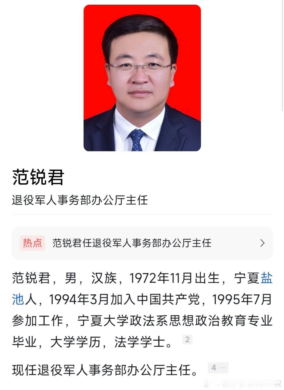 范锐君已任退役军人事务部办公厅主任。热点现场