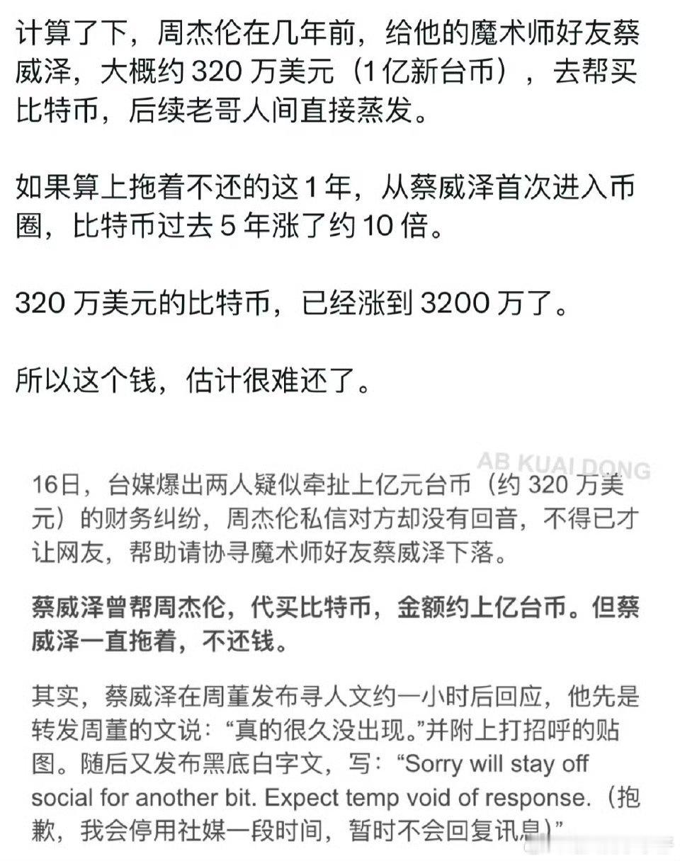 爆!周杰伦被魔术师朋友跑路3200万比特币!
