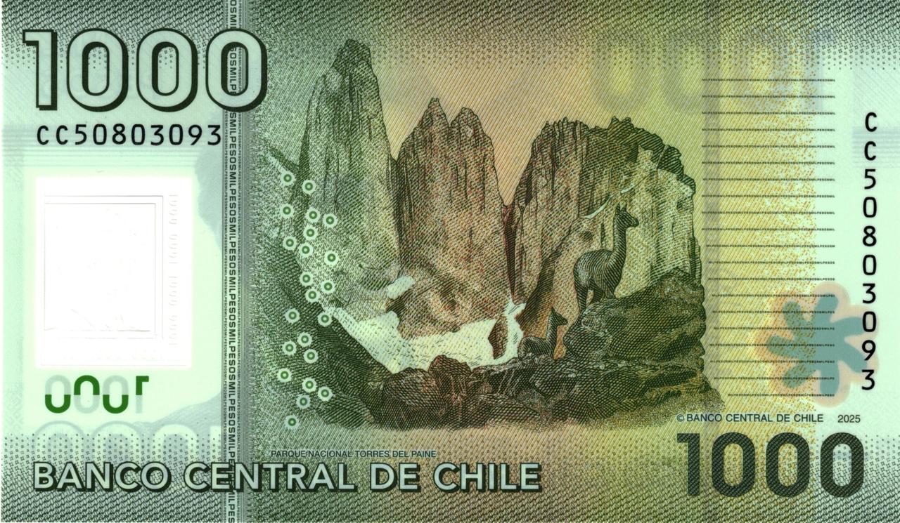 智利最新版(2025年)1,000比索钞票欣赏 设计与上一版(B296l)相同,但有新的签名(Costa/Herrera)和新的日期(2025)。 这张纸币保留了该面额特有的绿色,上面印有的人物是查卡布科营的队长伊格纳西奥·卡雷拉·平托,他也是太平洋战争康塞普西翁战役中的英雄。这幅肖像画由画家胡安·曼努埃尔·伊多布罗创作,现收藏于智利陆军军事学院。纸币正面印有智利南美百合和安图图案,倾斜纸币时,这些图案的绿色会发生变化。右侧有一个透明视窗,其中印有人物头像和面额。 纸币背面印有百内国家公园的主要景观——百内塔,该公园即以此命名。它位于麦哲伦地区的纳塔莱斯港,创建于1959年,以其壮丽的风景而闻名,是国际知名的旅游胜地。画面中还有两只原驼相伴,原驼是一种生活在秘鲁至火地岛安第斯山脉的哺乳动物。