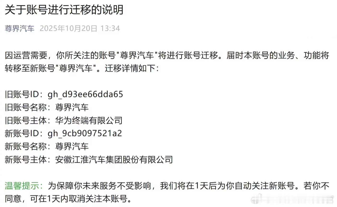 尊界汽车的公众号主体,从华为终端变更为江淮汽车了[并不简单]
