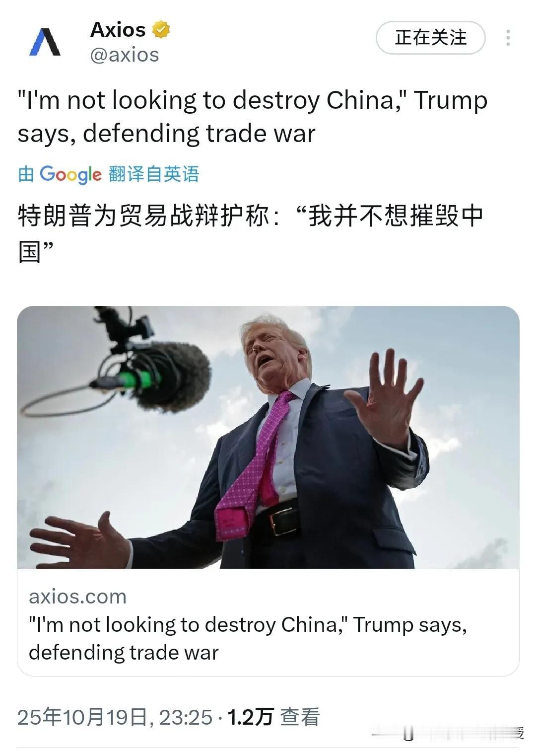 看下图,特朗普现在说话已经是在节节败退。他一边放狠话要加155%-157%的高额关税,一边又辩解说“不想摧毁中国”,这是他黔驴技穷在找台阶下! 中国稀土出口管制让他没了底气,手里没本没牌打,只会用老套路就是加关税。所以,现在特朗普面对福克斯新闻媒体的居高临下的“示弱”是为了两周后在韩国跟中方见面还能留点面子,不至于双方关系太紧张。从本质上看,特朗普根本没能力搞垮中国,只能靠嘴上功夫虚张声势,夜郎自大!