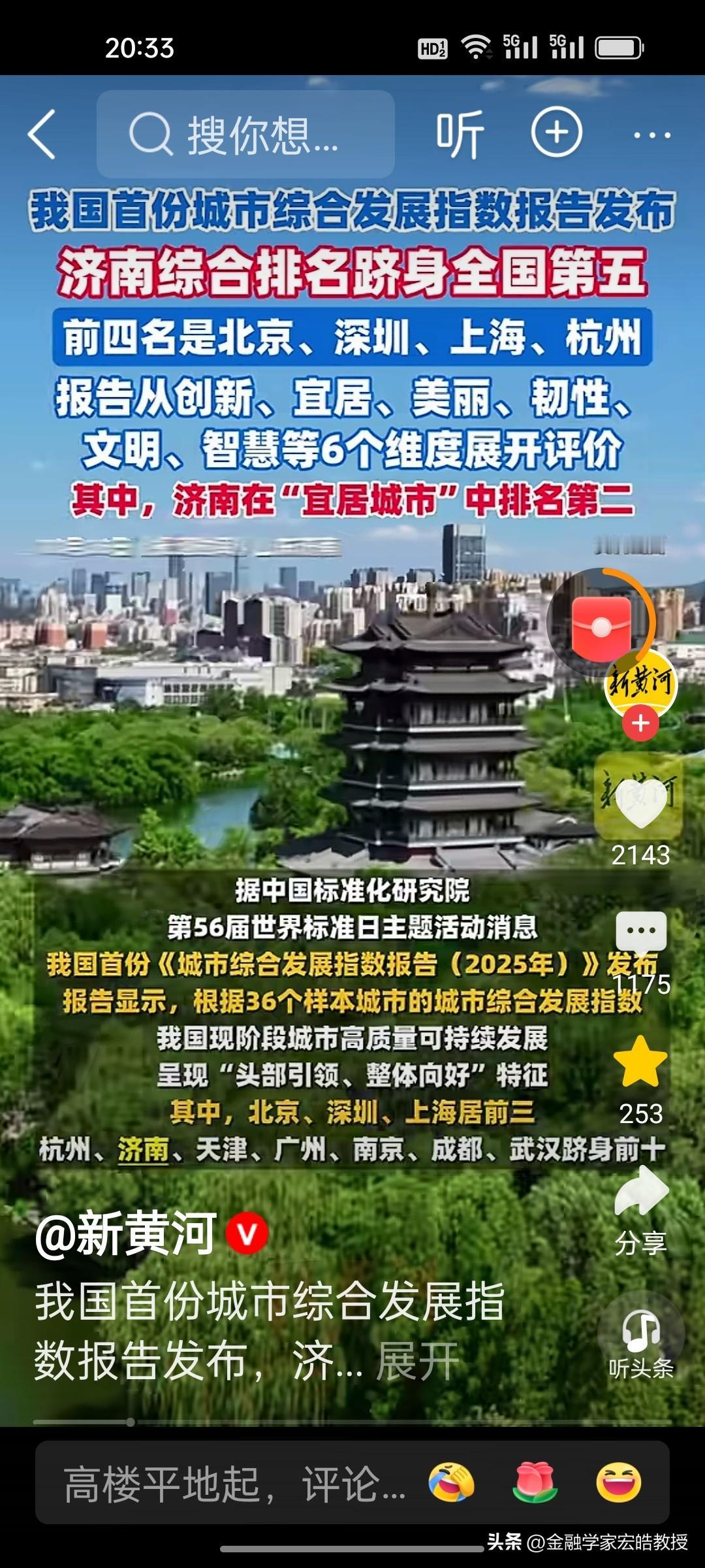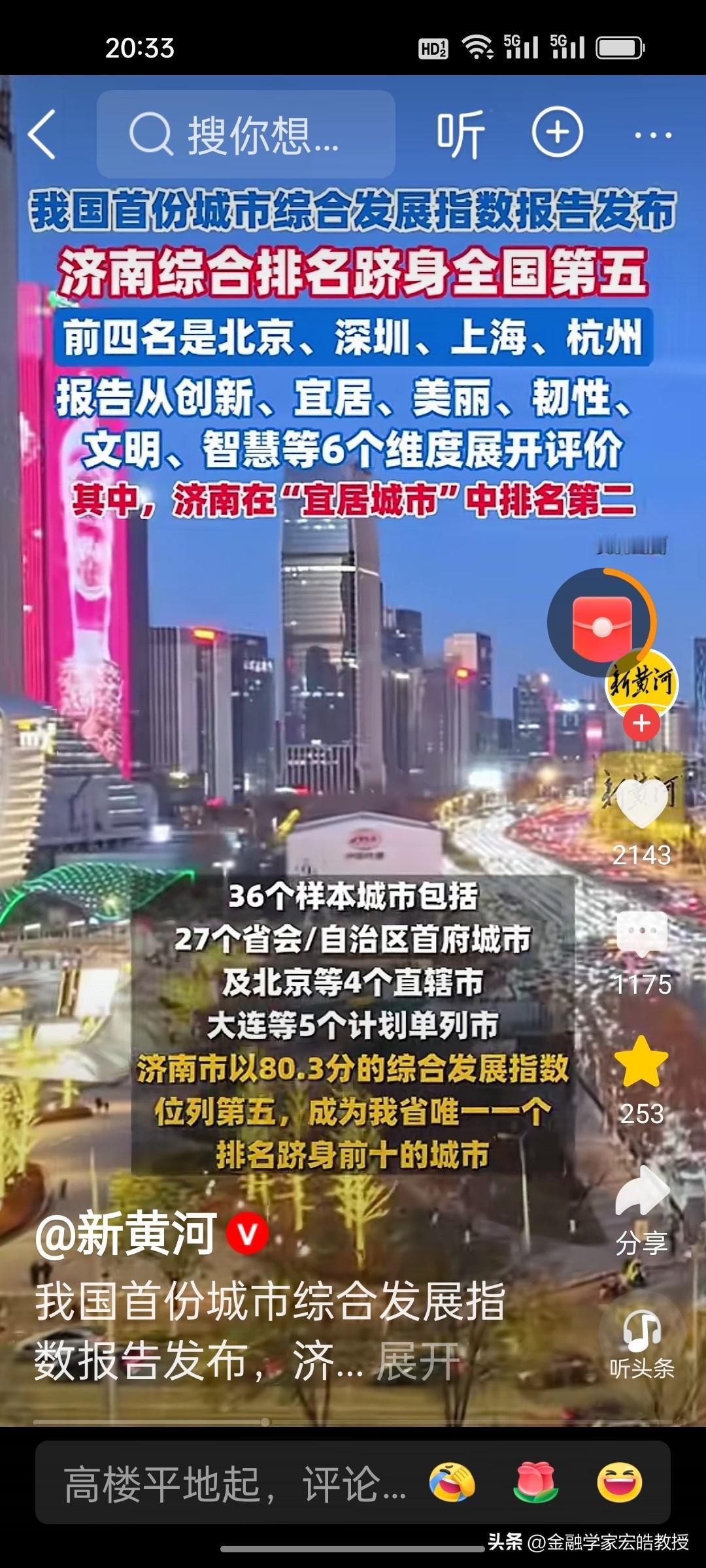 济南上榜排第五!刚刚看到《新黄河》报道,我国首份城市综合发展指数报告发布,济南在