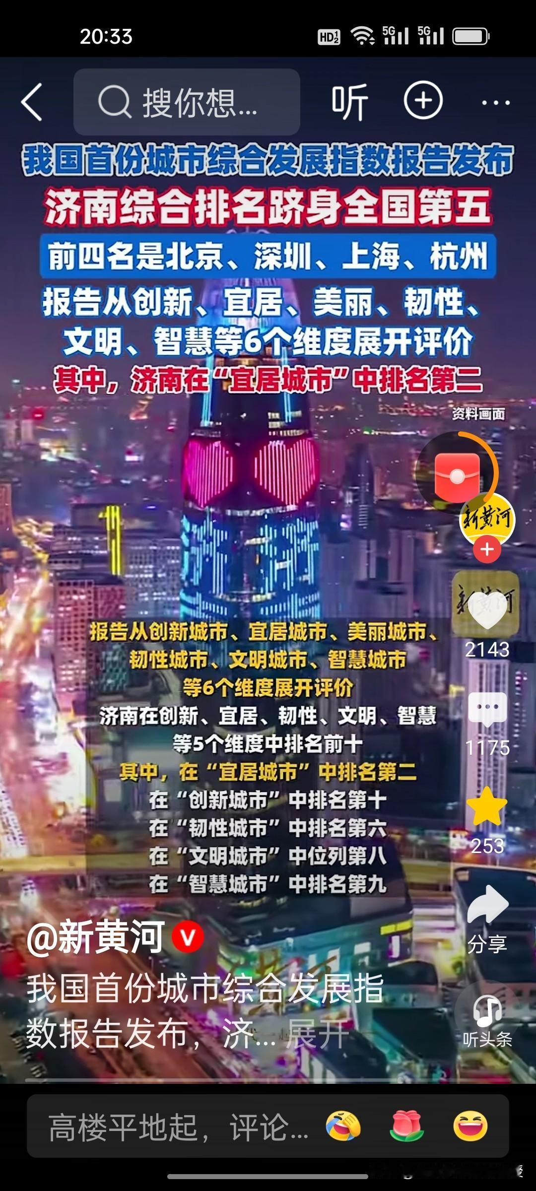济南上榜排第五!刚刚看到《新黄河》报道,我国首份城市综合发展指数报告发布,济南在综合排名中排第五,前四名是北京,深圳,上海,杭州,在宜居城市中济南排第二。 很多人可能不理解为什么成都,青岛都没有排在济南之前,这份报告不是单看GDP,而是从文明,韧性,智慧,创新,宜居,美丽六个维度展开评价。 济南能排宜居城市第二,或许也得益于其如老舍在1931年写的《济南的冬天》中笔下“温晴”般舒适的气候与独特的城市韵味,让宜居有了自然与人文的双重支撑。