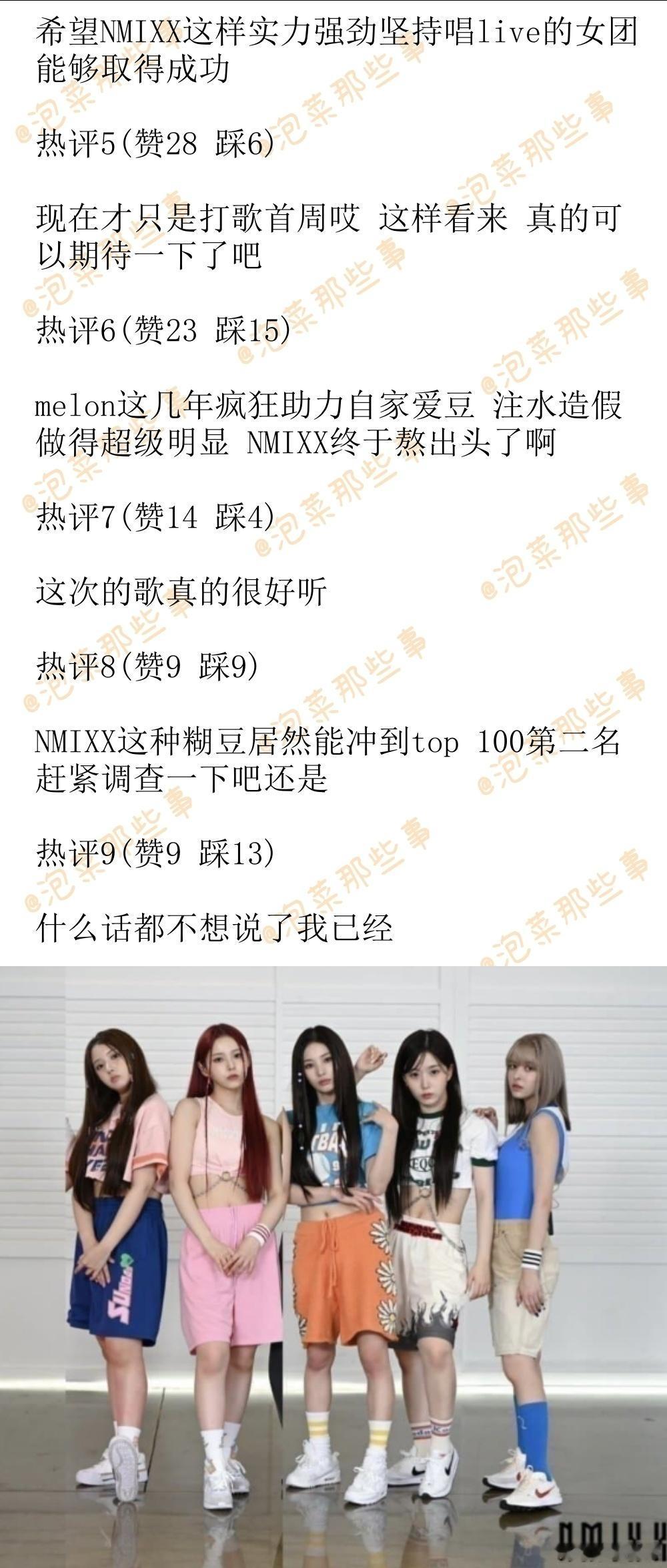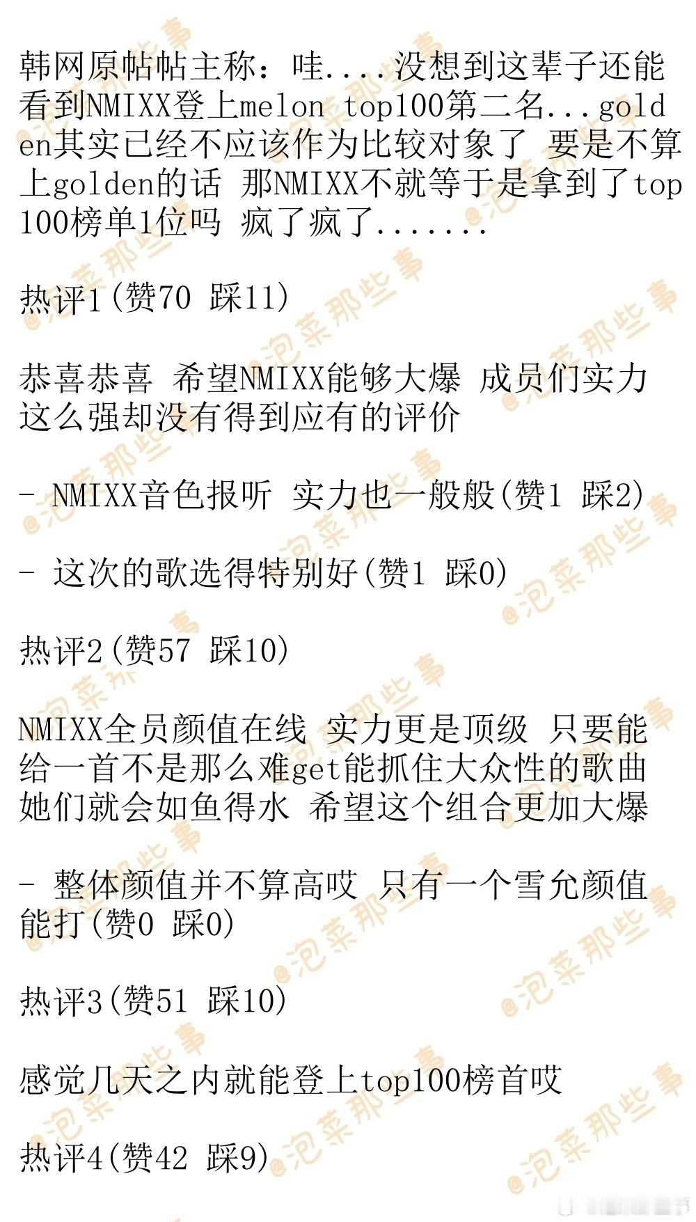 韩网原帖帖主称:哇....没想到这辈子还能看到NMIXX登上melon top100第二名..golden其实已经不应该作为比较对象了 要是不算上golden的话 那NMIXX不就等于是拿到了top100榜单1位吗 疯了疯了.......