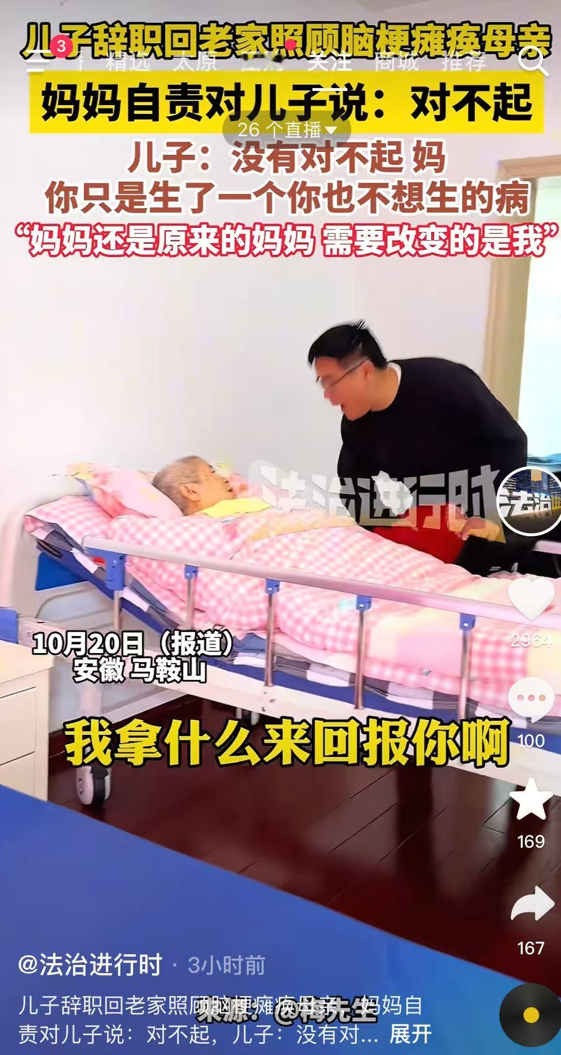 安徽马鞍山,每天清晨总能看到梅建军忙碌的身影,他端着温热的流食走进卧室,小心翼翼地扶起床上的老母亲,用勺子一点点喂进她嘴里,动作熟练又轻柔,这样的场景,已经持续了整整七年。 (来源:法治进行时) 七年前,梅建军在外地一家企业做技术主管,收入稳定,事业小有成就,一场突如其来的脑梗,打破了原本平静的生活,母亲术后落下严重后遗症,全身瘫痪、意识模糊,生活完全无法自理。接到医院电话的那一刻,梅建军没有丝毫犹豫,当即递交了辞职信,收拾行李返回了老家。 “当时就一个念头,妈养我小,我得养她老。”面对邻里的询问,梅建军总是这样平静地回应。从此,他成了母亲的“专职护工”:每天三次喂饭、定时翻身擦身、协助康复训练,夜里还要起身好几次查看母亲的状况,为了让母亲心情好些,他还学着唱歌、跳舞,哪怕母亲只有细微的反应,也能让他高兴许久。 周围的人都说梅建军是个大孝子,这份七年如一日的坚守,不仅是亲情的流露,更契合了法律对子女赡养义务的明确规定。 那么如何通过法律的角度看待此事呢? 1. 《民法典》第一千零六十七条第二款 成年子女不履行赡养义务的,缺乏劳动能力或者生活困难的父母,有要求成年子女给付赡养费的权利。该条文明确,赡养义务是成年子女的法定义务,不以个人意愿、经济条件波动或其他理由免除。 2. 《老年人权益保障法》第十四条 赡养人应当履行对老年人经济上供养、生活上照料和精神上慰藉的义务,照顾老年人的特殊需要。赡养人包括老年人的子女及其他依法负有赡养义务的人。梅建军的日常照料与精神陪伴,完整覆盖了这三项核心义务。 3. 《老年人权益保障法》第十五条 对生活不能自理的老年人,赡养人应当承担照料责任;不能亲自照料的,可以按照老年人的意愿委托他人或者养老机构等照料。此条为无法亲自照料的子女提供了合法途径,但委托照料不能替代子女的法定责任。 4. 《老年人权益保障法》第十九条 赡养人不得以放弃继承权或者其他理由,拒绝履行赡养义务。即使子女主张“无能力赡养”,也需在自身能力范围内承担照料、慰藉等责任,不可完全免责。 梅建军的七年坚守,是将法定的赡养义务升华为亲情的自觉;而法律的刚性规定,则为每一位老人的“老有所养”托底。 对此,你怎么看? 秋日生活打卡季