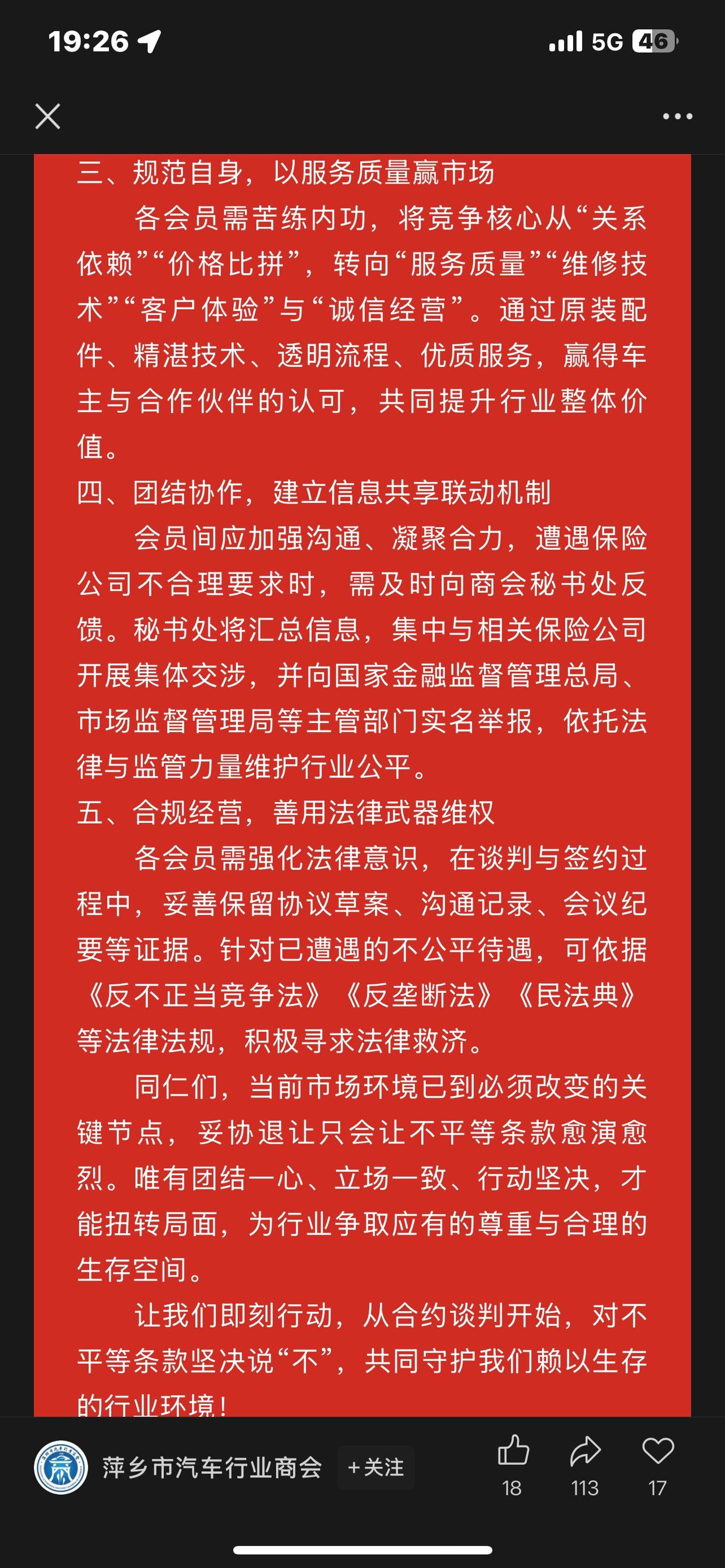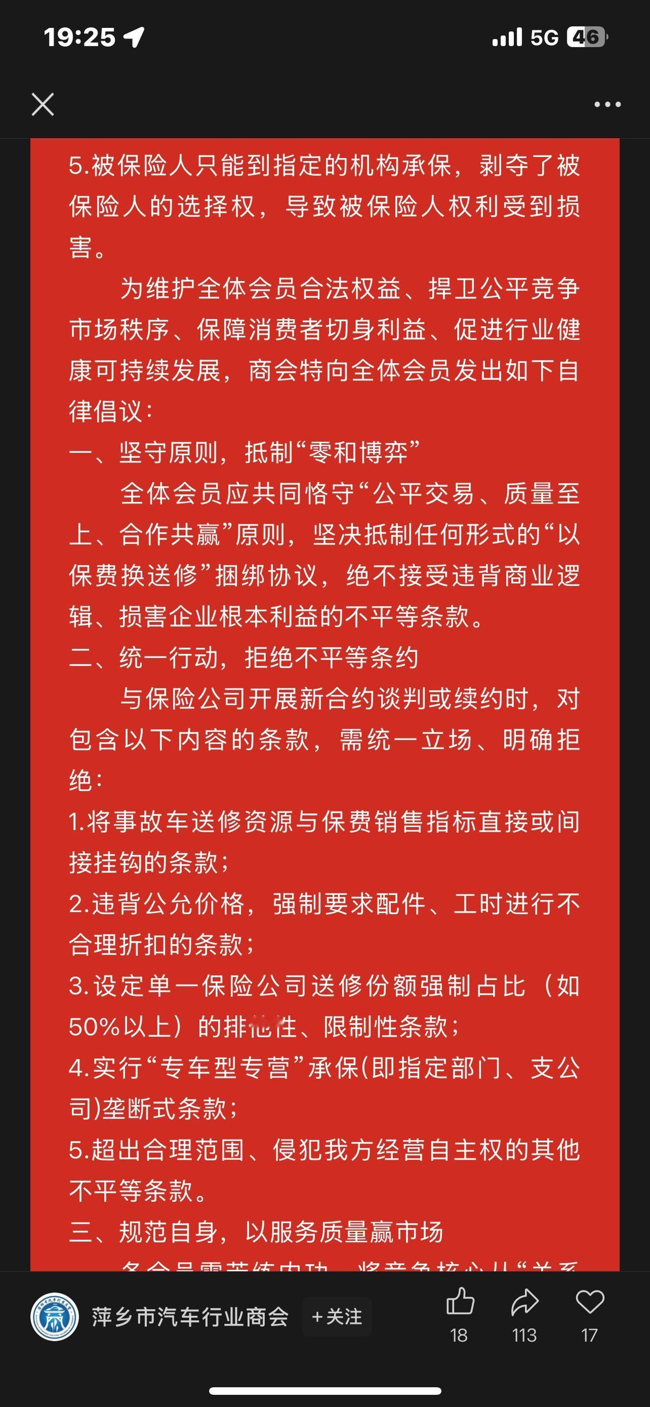 汽车产业链矛盾扩大化,今天看到一个倡议书,是汽车经销商协会,抵制保险行业协会的倡议。 说到底,就是利益分配的矛盾,已经很难协调了,卖车的经销商,靠保险返利和送修保障生存,地方保险行业协会,靠汽车保险维持生存。 但是矛盾点就在于,险种怎么选择,车险费用怎么算,返利怎么给,事故车返还给多少。 这些矛盾,是行业里面多少年的顽疾,一直解决不了的问题。 这个事情,真正离谱的是什么呢?保险公司和卖车的经销商,因为利益分配产生矛盾,但没有任何一方,去思考车主的要求是什么,在他们眼里,客户不是上帝,客户是肥肉[呲牙]