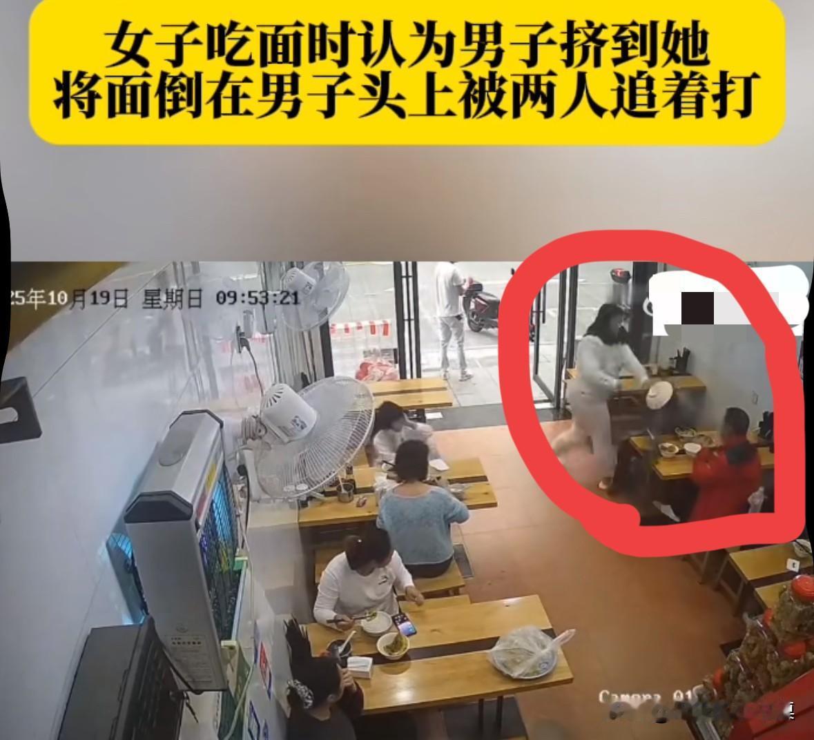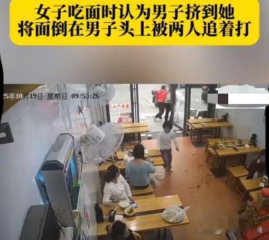 女子在吃面时,认为后面的人挤到了她,于是直接把面扣到对方的头上。 男子被烫到后,