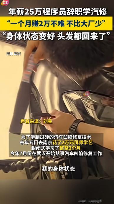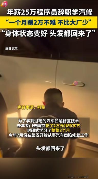 “人各有命啊!”近日,湖北武汉,一30岁男子从双一流大学硕士毕业后,放弃了高薪的程序员工作,反而做起了汽修工作,他表示一个月赚20000元轻轻松松,最重要的是他的头发都长回来了!网友:这才是每个人有每个人的活法啊。 一般人都觉得,能考上双一流大学硕士的人,毕业就该进高端写字楼,坐在格子间里干体面活,但武汉有个 30 岁的男人,偏不走这条路,打破了这种固定的职业想法,让不少人开始琢磨,选工作到底该看啥。 小刘(化名)硕士计算机毕业证之后就进入了一家公司,一年的年薪能够开到二十五万元,但他一直觉得这并不是他想要的生活,于是就毅然决然的辞职了,选择了汽修这个行业。 这不是一时冲动换工作,是他仔细想清楚后,重新规划自己人生价值的决定,他把做程序员时练的系统性思维,和修车这种动手手艺结合起来,最后不光不用愁钱,还把以前丢了的生活质量找了回来。 在今年七月份的时候小刘就开始了专门上门服务的汽车凹陷修复,这样不仅打破了原有的固定式修车,还直接省了一大笔房租,买套国产专业工具,花不到 5000 块,启动成本低,做起来也灵活,不用被店面绑住。 他给每单定价 200 到 300 块,车主都觉得划算,加上上门服务能让车主不用跑修理厂,很多人都愿意找他,生意很快做起来了,现在他平均一天接三四单,订单有时排到一个月后,每个月稳赚 2 万左右,也证明这条路走得通。 以前做程序员练的抽象思维,现在用来优化修车手艺,去培训机构学技术时,用系统化方法学习,别人要三四个月,他两个月就学会了。 他还像优化代码那样,把接单、上门、修车、听反馈的步骤理清楚,效率和口碑都变好,和传统修车师傅靠经验干活不一样。 之前也有北漂程序员转行开网约车成 “单王” 的,他们都有个共同点,把业务拆成流程,用系统化方式管理优化,这就是高学历背后的能力。 他这次换工作,最有价值的地方在于重新定义了 “成功”,不再只盯着赚多少钱,而是看身体好不好、自己过得开不开心,用这些真实的情况,打破了 “工资越高就越成功” 的老想法。 现在每个月赚的钱虽然比以前少,但每天作息规律,心里也安稳,之前掉的头发还慢慢长回来了。 更关键的是心态不一样了,以前是跟着项目走,被动地干活,现在自己安排订单,连一个月后的活儿都能提前规划好,从被代码算法逼着往前走,到自己定规矩,这种变化让他心里特别满足。 这件事情被网友刷到了之后,有一位网友评论说 “这才是每个人有每个人的活法”,这话也能看出来,现在大家对 “成功” 的看法,变得更多样、更实在了。 这个武汉硕士的转行,是一次把商业想法、能力转换和自我认知结合起来的成功尝试。他没扔了以前学的知识,而是把知识的核心用到了新领域,让这些能力发挥出了不一样的作用。 那么通过这件事情也告诉我们,真正的保障,不是某个固定的职位,也不是一张文凭,而是那种能不断学习、把能力用到不同地方,最后为自己创造价值的综合能力。 或许,这才是教育最终想让我们拥有的东西。 对此,你还有什么看法呢? (信息来源 :广州ing )